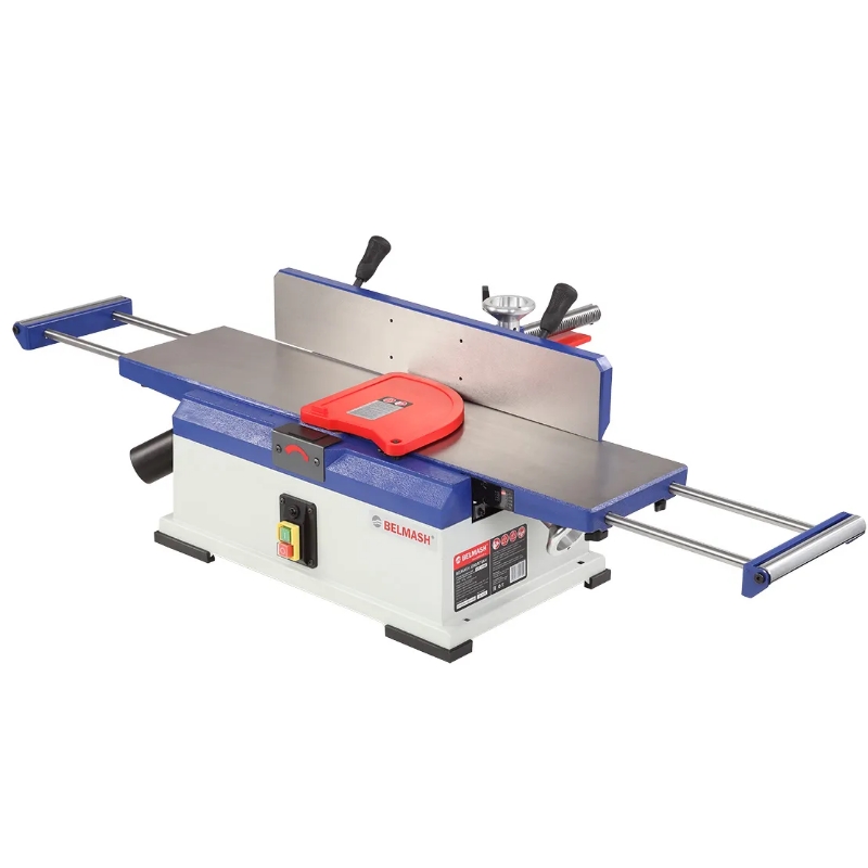 Станок фуговальный BELMASH предназначен для обработки заготовок шириной до 200 мм. Подойдет для хоббийной и профессиональной мастерской с малым объёмом пространства. Исполнение настольное. Чугунные рабочие столы и параллельный упор обеспечивают комфортную работу и минимум вибраций. Параллельный упор позиционируется под 90° относительно рабочего стола, 45° во внешнюю и внутреннюю стороны. Для этого предусмотрены ограничители. Способ перемещения упора – реечный, более точный механизм выставления угла. Станок оснащен коллекторным двигателем с частота вращения вала на холостом ходу 23 000 об./мин и мощностью 1500 Вт. Вал двухножевой, частота вращения вала составляет 10 000 об/мин. Это обеспечивает чистый рез при работе с различной древесиной. Глубина строгания регулируется, максимальная – 3,2 мм. Для безопасности строгальный вал имеет защитный кожух. Подающий и приёмный столы перемещаются по направляющим «Параллелограмм». Это более удобный механизм перемещения и фиксации столов. В данной модели имеется собственная система стружкоудаления: крыльчатка и мешок-стружкосборник 350 × 725 мм. Плюсы: чистота в мастерской и экономия бюджета. Для снижения вибраций станка и его надежной установки на основание установлены виброгасящие ножки. В основании станка предусмотрены специальные монтажные отверстия, которые позволяют закрепить его на ровной твердой поверхности. Станок имеет компактные размеры, легко разместится в маленькой мастерскойПреимущества Увеличенная длина рабочих столов за счёт расширителей Рабочие столы и параллельный упор из высококачественного чугуна Собственная система пылеудаления Направляющие «параллелограмм» для перемещения рабочих столов Простая настройка углов наклона параллельного упора Два толкателя в комплекте поставки Компактность и мобильность