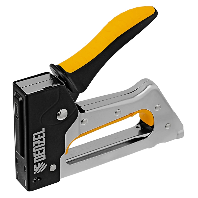 Металлический степлер Denzel с двухкомпонентной рукояткой используется для сборки и обивки мебели, фиксации изоляционных материалов, а также других монтажных и отделочных работ с помощью скоб типа 53 размером 6-10 мм. Позволяет быстро соединять с деревянным основанием листовые материалы из ДВП, ДСП, картона, оргалита, фанеры, пленки ПВХ. Благодаря рессорному ударному механизму инструмент не требует от пользователя значительных усилий, поэтому подходит для длительной работы.Преимущества Прочность — стальной корпус, изготовленный методом штамповки, устойчив к деформации Защита от коррозии — благодаря хромированию и порошковому покрытию инструмент не разрушается под воздействием влаги Быстрая загрузка скоб — благодаря выдвижной обойме «зарядка» инструмента занимает несколько секунд Контроль наличия скоб — в боковой части корпуса предусмотрено специальное окошко Комфортная работа — двухкомпонентная обрезиненная рукоятка не выскальзывает из ладони Расходники в комплекте (200 шт.) — крепеж не нужно приобретать отдельно, степлер полностью готов к работе Безопасное хранение и перемещение — рукоятка фиксируется в транспортировочном положении, что исключает случайное срабатывание ударного механизма