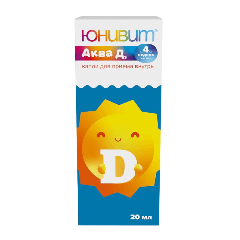 Юнивит Аква Д3 показан для профилактики и дефицита витамина D и заболеваний, связанных с его недостаточностью (рахит, остеомаляция); лечения рахита; комплексной терапия остеопороза различного генеза, для поддержания тонуса мышц скелетной мускулатуры, функции миокарда, способствует проведению нервного возбуждения, регулирует процесс свертывания крови, предотвращает аутоиммунные заболевания (сахарный диабет 1 типа, рассеянный склероз, ревматоидный артрит, воспалительные болезни кишечника и др.)