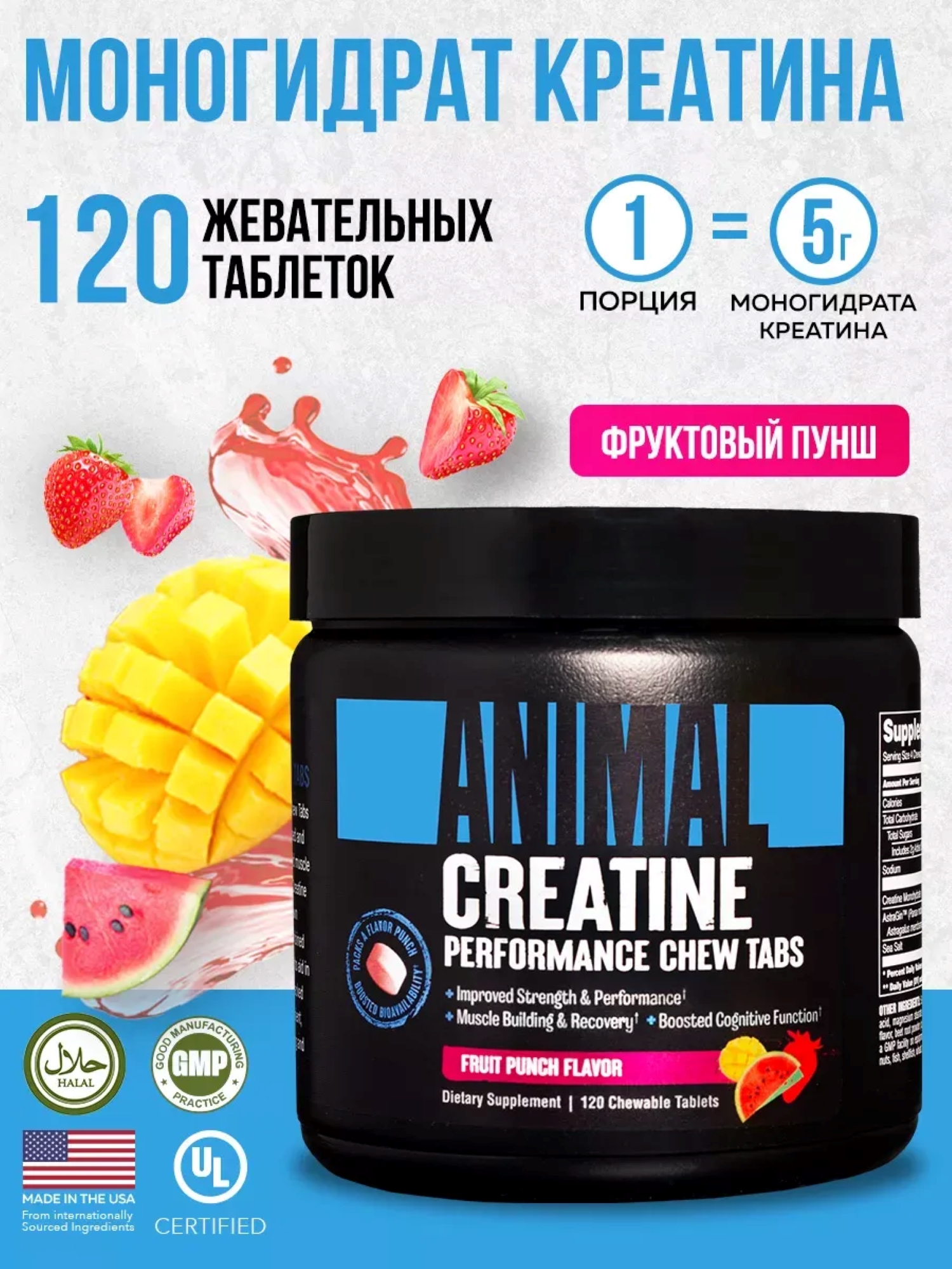 Animal Creatine Chews - креатин в виде вкусных жевательных таблеток от компании Animal, спортивное питание от мировых производителей. Animal Creatine Chews - микронизированный креатин животного происхождения, легко усваиваемый моногидрат в удобной форме жевательных таблеток. Таблетки изготовлены из ингредиентов премиального качества и прошли строгие испытания на соответствие мировым стандартам. Содержат специальный компонент собственной разработки Астрагин для наилучшего усвоения всех питательных веществ. Animal Creatine Chews представлены в двух приятных вкусах - Фруктовый пунш и Виноград. Креатин - важный источник энергии. Он помогает мышцам дольше сохранять максимальную производительность за счет синтеза важной энергетической молекулы АТФ - аденозинтрифосфат. Спортсмены выбирают креатин для повышения выносливости, быстрого восстановления после тренировок и скорейшего равномерного набора мышечной массы. Действие Animal Creatine Chews: • Обеспечивает мышцам запас гликогена и строительного материала; • Увеличивает силу и объем мышц, способствует их росту; • Насыщает ткани организма кислородом и повышает общий уровень энергии; • Помогает скорейшему восстановлению после тренировки за счет подавления выработки молочной кислоты и снижения посттренировочных болей; • Препятствует быстрому наступлению усталости во время тренировки, за счет повышения выносливости помогает тренироваться эффективнее и дольше; • Способствует здоровой работе мозга и нервной системы, улучшает когнитивные функции. Преимущества Animal Creatine Chews: • Наиболее удобная форма, не требующая дополнительных действий - растворения и смешивания; • Превосходное усвоение - моногидрат креатина с Астрагин абсорбируется максимально быстро; • Экономичная упаковка - 120 таблеток (30 порций); • Целых 5 г креатина моногидрата в одной порции; • Приятный вкус и удобный размер таблеток. Показания к применению: в качестве биологически активной добавки к пище, дополнительного источника креатина. Способ применения: Взрослым принимать по 4 жевательных таблетки в день, во время приема пищи. Продолжительность ежедневного приема - 1 месяц.