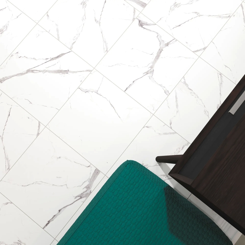 - Лицевая гладкая матовая поверхность с геометрическим рисунком под мрамор обладает высокой устойчивостью к царапинам, поэтому выдерживает хорошую проходимость (значение 4 из 5 по стандарту PEI).