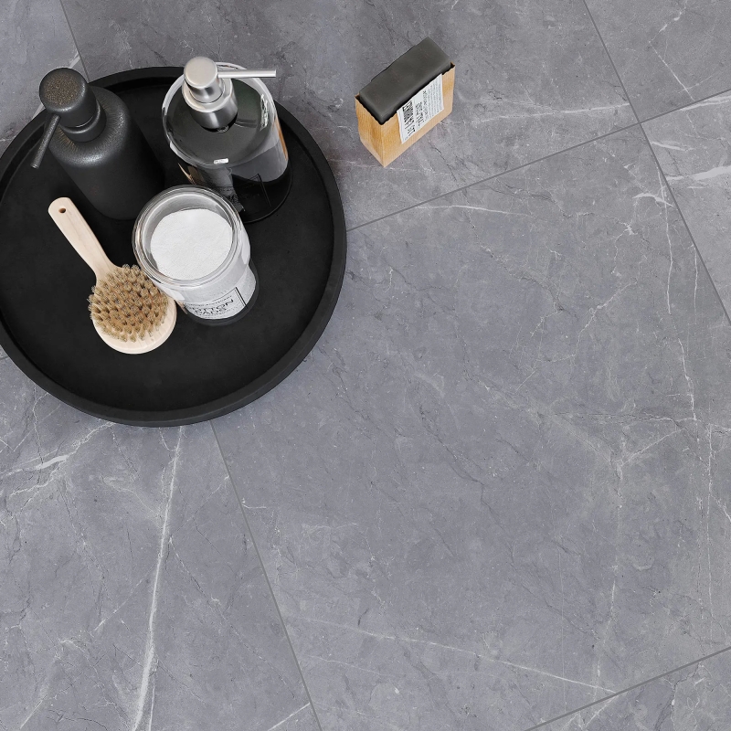 - Лицевая гладкая матовая поверхность с геометрическим рисунком под мрамор обладает высокой устойчивостью к царапинам, поэтому выдерживает хорошую проходимость (значение 4 из 5 по стандарту PEI).