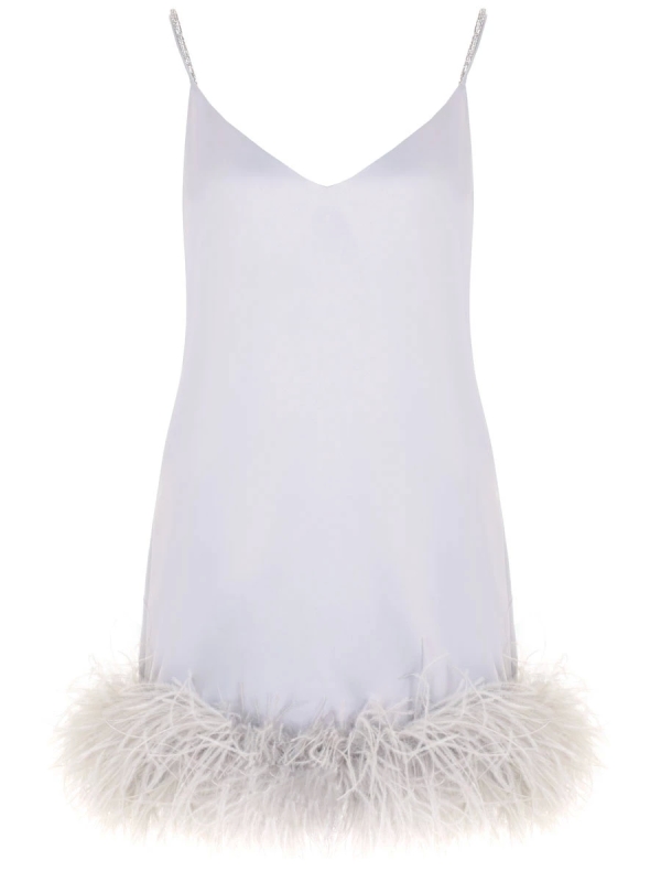 -Модель полуприлегающего кроя на узких бретелях с декоративным шнуром из страз и перьями страуса на подоле.