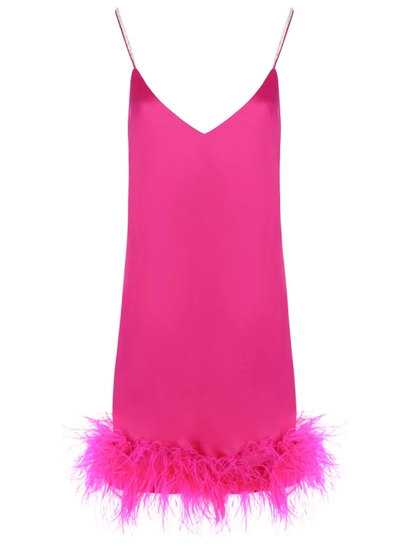 -Модель полуприлегающего кроя на узких бретелях с декоративным шнуром из страз и перьями страуса на подоле.