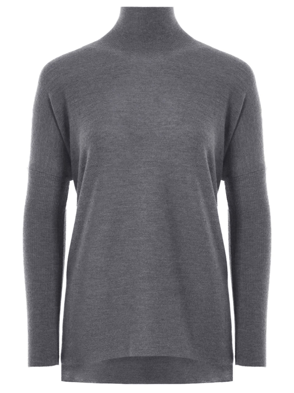 -Свободный асимметричный крой по длине спинки, длинные рукава, высокий ворот.
