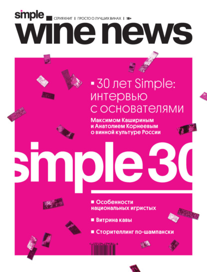 Simple Wine News – издание, посвященное новостям виноделия, виноторговли и ресторанного бизнеса, культуры потребления вина, винным путешествиям и другим аспектам мира вина и гастрономии. Simple Wine News регулярно проводит собственные дегустации, в которых принимают участие известные винные эксперты, критики и сомелье. Издание предназначено для широкой аудитории ценителей и знатоков вина, а также профессионалов винного рынка. Читайте в выпуске: К 30-летию Simple Максим Каширин и Анатолий Корнеев впервые рассказывают SWN о личных винных предпочтениях. А также о больших трендах в мире вина Ассамбляж Итоги года: от акцизов и пошлин до русских проектов в дубайской хореке Дегустации-вечеринки и винная «мафия» в винотеках SimpleWine Традиции благотворительности на «Белом трюфеле» Спойлеры к арт-календарю Simple на 2025 год Главное с III Российского винодельческого форума Дом портвейна Barros: в России надёжно Игристый контент Несколько российских виноделов с опытом создания игристых по классике раскрывают множество любопытных деталей о производстве, «связях» с Шампанью и личных пристрастиях Полезная карта Шампани и тренды с домом Lanson Ежегодно к Новому году пробуем срез Шампани и многое другое
