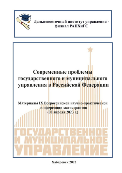 Материалы, подготовлены на основе докладов магистрантов на региональной научно-практической конференции «Современные проблемы управления в Российской Федерации», проходившей в Дальневосточном институте управления – филиале РАНХиГС 08 апреля 2023 г. (г. Хабаровск) Материалы предназначены для руководителей и специалистов государственного и муниципального управления, преподавателей, аспирантов, студентов и тех, кто интересуется приоритетными направлениями деятельности органов государственной власти и местного самоуправления в Дальневосточном федеральном округе. Авторы опубликованных материалов несут ответственность за подбор и точность приведенных фактов, цитат, экономико-статистических данных, собственных имен, географических названий.