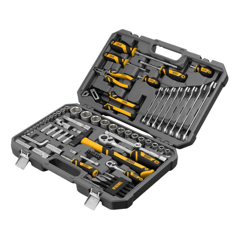 Набор инструментов Denzel состоит из 84 предметов с присоединительными квадратами 1/4″ и 1/2″, упакованных во вместительный ударопрочный кейс собственной разработки с антивандальным покрытием. В комплект поставки входят инструменты и оснастка для монтажа и демонтажа резьбовых соединений, а также молоток, плоскогубцы, переставные клещи, кернер, бородок, зубило, крейцмейсель и выколотка для выполнения слесарных и сантехнических работ. Набор предназначен для профессионального использования в автомастерской, будет полезен и для решения бытовых вопросов.Преимущества Устойчивость к высоким нагрузкам — инструменты изготовлены из высокопрочной закаленной стали CrV, биты и отвертки выполнены из японской стали S2 Повышенная устойчивость к коррозии — двойное хромовое покрытие предотвращает появление ржавчины Прочность — усиленные комбинированные ключи из закаленной хромованадиевой стали выдерживают интенсивное использование Устойчивость к динамическим нагрузкам — место крепления фибергласовой рукоятки к рабочей части молотка усилено, закаленный боек из кованой стали C45 не подвержен появлению трещин и сколов (немецкий стандарт DIN) Эффективная работа плоскогубцами — шарнир смещен к режущим кромкам, что увеличивает усилие сжатия на 20% Удобная работа в труднодоступных местах — 90-зубый храповой механизм ключей-трещоток обеспечивает плавный ход, угол поворота составляет всего 4° Быстрый переход от одной задачи к другой — все трещотки имеют функцию быстрого сброса и металлический переключатель реверса Уверенный захват — благодаря антискользящим насечкам даже влажные или замасленные инструменты не выскальзывают из рук Надежная фиксация — свечные головки снабжены магнитным держателем Эффективность — отвертки с 6-гранным сечением и профилем под гаечный ключ позволяют увеличить крутящий момент, намагниченные фосфатированные наконечники надежно фиксируются в головке крепежа Комфортная и безопасная работа — эргономичные двухкомпонентные рукоятки отличаются масло- и бензостойкостью Продуманная система хранения — элементы набора надежно зафиксированы в ложементе кейса, дополнительные крепления удерживают торцевые головки Быстрый поиск нужного инструмента — в кейсе предусмотрена маркировка типоразмеров элементов набора, можно без труда достать и положить нужный инструменБезопасная транспортировка — антивандальное шагреневое покрытие обеспечивает сохранность кейса, металлические хромированные замки надежно удерживают его закрытым.