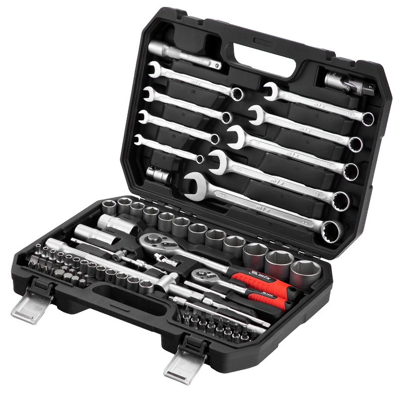Набор инструментов MTX , 1/2", 1/4", пластиковый кейс, 82 предмета - предназначенных для слесарных работ, преимущественно монтажа и демонтажа резьбового крепежа с разными типами шлицев. В комплект поставки входят карданы, удлинители и переходники, облегчающие работу в труднодоступных местах. Набор используется для ремонта автомобилей, а также полезен в быту.Преимущества Износостойкость — элементы набора изготовлены из высокопрочной стали Надежная защита от коррозии — на инструменты нанесено матовое хромовое покрытие Комфортная и эффективная работа — ключи-трещотки с 45 зубьями оснащены механизмом быстрого сброса, переключателем реверса с металлическим флажком и двухкомпонентной рукояткой Прочная фиксация — шариковый замок на трещотках, воротках, шарнирах и удлинителях надежно удерживает головки Удобное хранение и транспортировка — инструменты и насадки упакованы в ударопрочный пластиковый кейс с металлическими замками