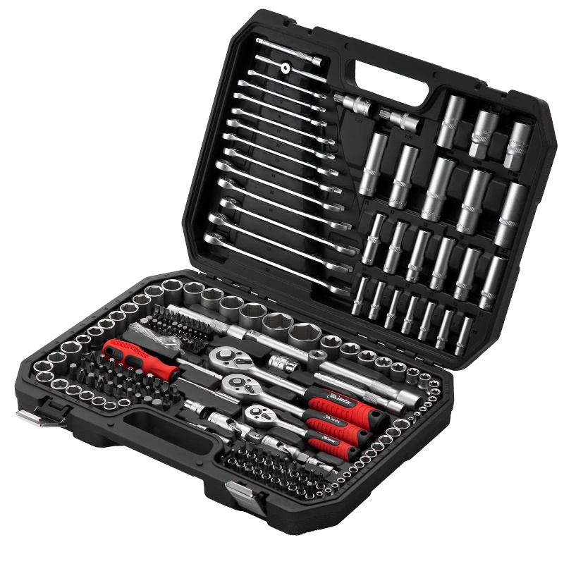 Набор инструментов MTX , 1/2", 3/8", 1/4", пластиковый кейс состоит из 215 предметов с присоединительным размером 1/2", 3/8", 1/4", предназначенных для монтажа и демонтажа резьбового крепежа с разными типами шлицев. В комплект поставки входят карданы, удлинители и переходники, облегчающие работу в труднодоступных местах. Набор используется для ремонта автомобилей, а также будет полезен в быту.Преимущества Износостойкость — элементы набора изготовлены из высокопрочной стали Надежная защита от коррозии — на инструменты нанесено матовое хромовое покрытие Комфортная и эффективная работа — ключи-трещотки с 45 зубьями оснащены механизмом быстрого сброса, переключателем реверса с металлическим флажком и двухкомпонентной рукояткой Прочная фиксация — шариковый замок на трещотках, воротках, шарнирах и удлинителях надежно удерживает торцевые головки Удобное хранение и транспортировка — инструменты и насадки упакованы в ударопрочный пластиковый кейс с металлическими замками