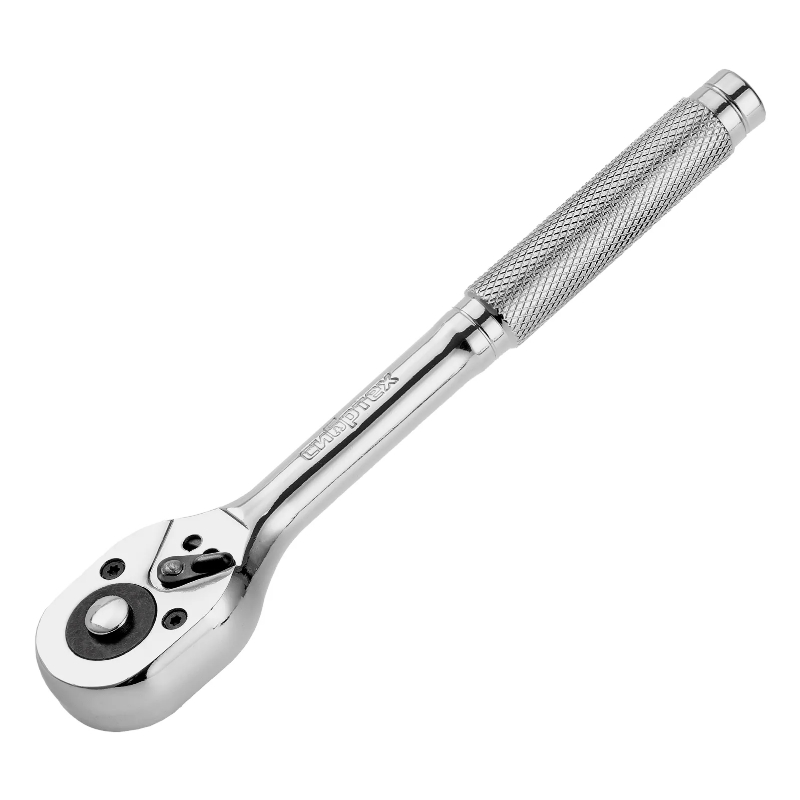 Цельнометаллический хромированный ключ-трещотка Сибртех из стали CrV, с посадочным размером 3/8″ и 45-зубым храповым механизмом, с функцией быстрого сброса, используется для монтажа и демонтажа резьбовых соединений. Предназначен для установки торцевых головок, адаптеров и удлинителей. Цельнометаллическая конструкция отличается повышенной прочностью, что позволяет работать со значительным усилием. Инструмент пригодится дома, в гараже и в поездкеПреимущества Прочность — ключ изготовлен из закаленной хромованадиевой стали и выдерживает высокие нагрузки Долговечность — хромированная поверхность устойчива к образованию коррозии Функция реверса — при помощи переключателя с металлическим флажком можно одним движением изменить направление вращения трещотки Надежная фиксация — шариковый замок крепко удерживает торцевую головку, поэтому она не соскочит во время работы Быстрый сброс — достаточно нажать на кнопку, чтобы освободить головку от насадки, это особенно удобно для работы с крепежом разного размера