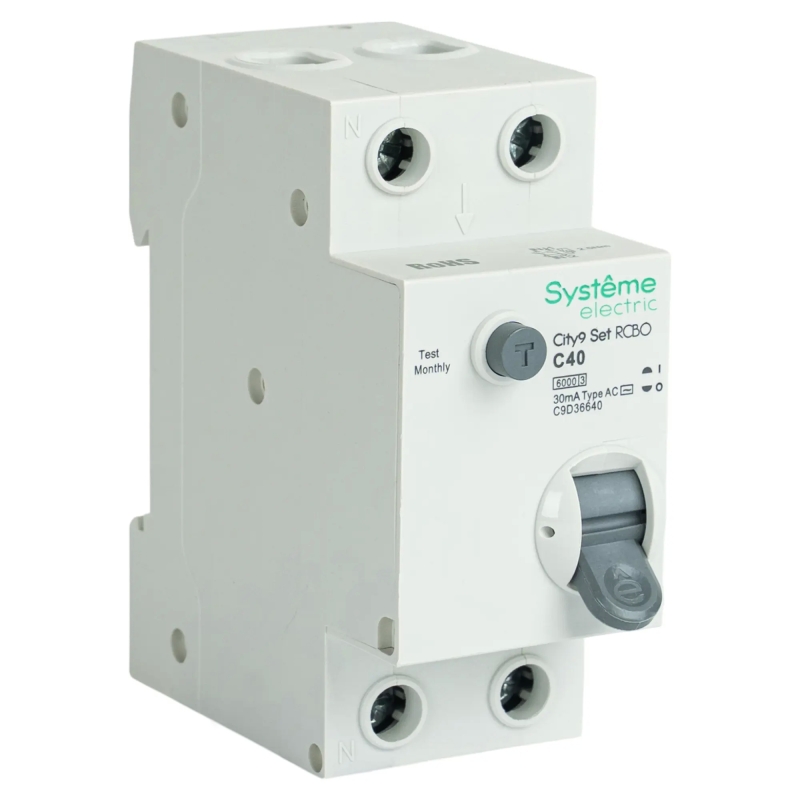 **Автоматические выключатели дифференциального тока (АВДТ) серии City9 Set Systeme Electric,1P+N, номинальный ток 40 А, характеристика С, Icn = 6 кА, ток утечки 30 мА, тип АС.** АВДТ применяется в электрических сетях напряжением 230В. Предназначен для защиты сети от перегрузок, людей от поражения электрическим током и токов короткого замыкания. Уставка по току утечки 30 мА обеспечивает гарантированную защиту людей при прямом прикосновении. Кнопка тест обеспечивает проверку работоспособности аппарата. Крепление на DIN-рейку шириной 35 мм. Безопасные клеммы.