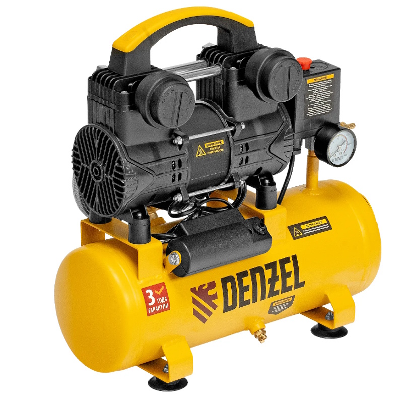 Компрессор безмасляный Denzel мощностью 950 Вт и производительностью 170 л/мин, с ресивером объемом 10 л, оснащен двигателем со скоростью вращения 2850 об/мин. Предназначен для обеспечения пневмоинструмента сжатым воздухом. Для работы компрессора не требуется масло, поэтому он подходит для проведения покрасочных работ и продувки электронных компонентов. Прямой привод обеспечивает максимально эффективную работу и высокую производительность. Благодаря низкому уровню шума эксплуатация компрессора не вызывает ощущение дискомфорта.Преимущества: Автономность - специальное реле останавливает компрессор по достижении максимального рабочего давления и запускает двигатель при падении давления до минимального уровня Безопасность - в случае превышения максимального давления в ресивере срабатывает предохранительный клапан, что позволяет избежать аварийных ситуаций Контроль давления - компрессор оснащен удобным манометром Термозащита - двигатель отключается при превышении критической температуры обмоток для предотвращения их оплавления Защита по току - в случае перегрузки двигатель останавливается, что защищает его от поломки Регулировка давления - можно установить необходимый уровень в зависимости от подключаемого инструмента Простое присоединение - благодаря быстросъемному коннектору подключение пневмоинструмента не занимает много времени Снижение уровня вибраций - 4 виброопоры гасят колебания, возникающие во время работы Гарантия 3 года -надежность компрессора подтверждена производителем