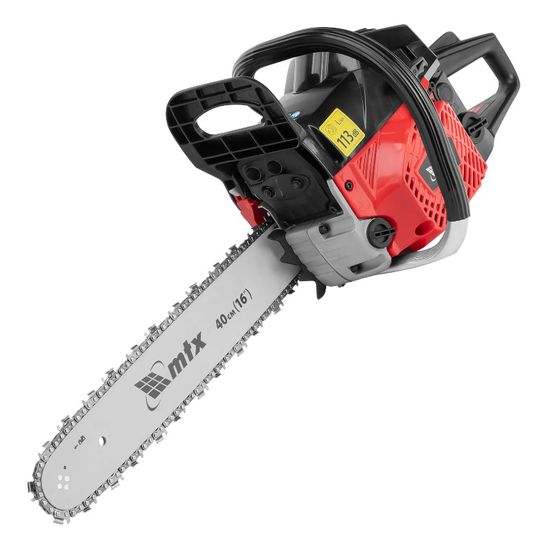 Цепная бензиновая пила MTX оснащена двигателем объемом 45 см3 и мощностью 2,5 л.с. Предназначена для распиловки древесины, используется для валки деревьев, а также для распиливания веток, опиливания сучков и заготовки дров. Комплектуется шиной длиной 40 см, с шагом цепи 0,325″ и 64 звеньями, с пазом 1,5 мм. Будет полезна для проведения ремонтных, строительных работ, облагораживания сада и т.д.Преимущества Быстрый старт — насос подкачки топлива (праймер) облегчает запуск двигателя Безопасная эксплуатация — функция блокировки газа предотвращает случайный запуск, тормоз цепи снижает риск травмирования при отскоке пилы Комфортная работа — зубчатый упор помогает удерживать пилу и уменьшает отдачу Высокий ресурс — масло автоматически подается к шине и цепи в необходимом количестве в зависимости от скорости двигателя, такое решение позволяет значительно уменьшить износ пильной гарнитуры Простая подготовка к работе — натяжение цепи регулируется при помощи винта Удобное приготовление топливной смеси — емкость для смешивания бензина и масла входит в комплект поставки Продуманное хранение и транспортировка — в комплект поставки входит защитный чехол для шины