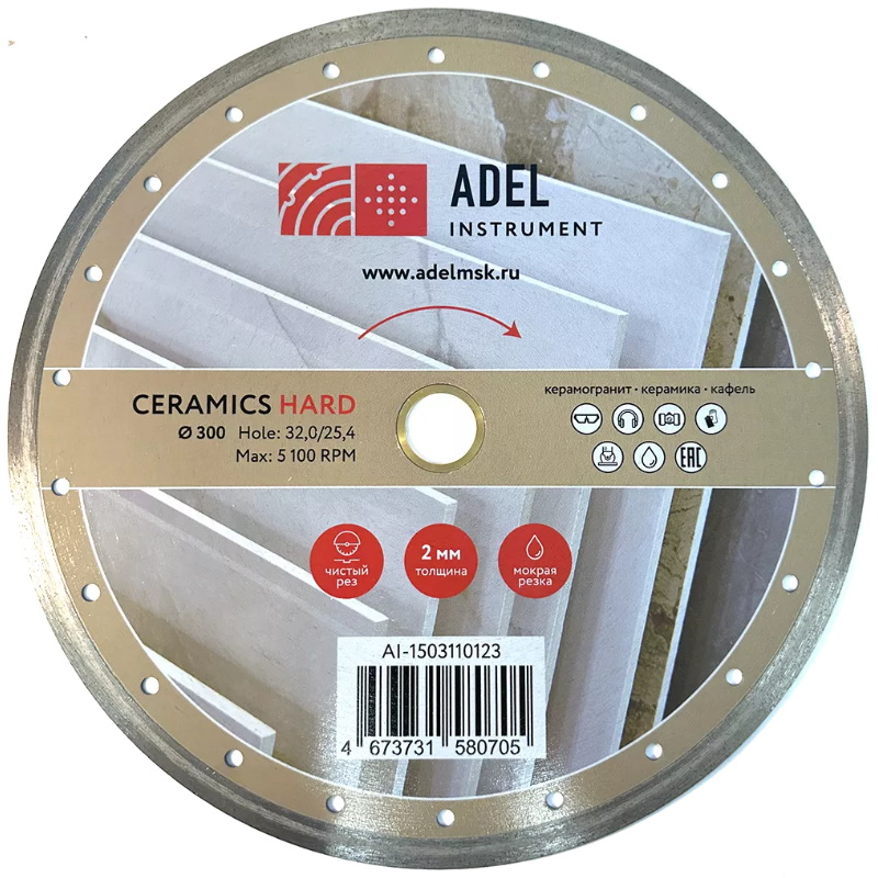 Диск алмазный Adel Instrument , сплошной, Ø300*2.0*11*32.0/25.4 - предназначен для мокрой резки изделий из керамогранита, керамической плитки, мрамора.Преимущества Режущая кромка 2.0 мм позволяет добиться точного и аккуратного реза Высокий алмазный слой 11 мм, изготовленный методом горячего спекания, увеличивает ресурс оснастки и скорость выполнения работ Влажная резка Использование воды при выполнении работ улучшает охлаждение оснастки, снижает пылеобразование и продлевает срок службы изделия