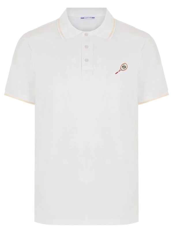 -Модель прямого кроя с короткими рукавами, узкими манжетами, отложным воротником, контрастной окантовкой деталей, застежкой на пуговицы на груди, вышивкой на груди в тематике тенниса.