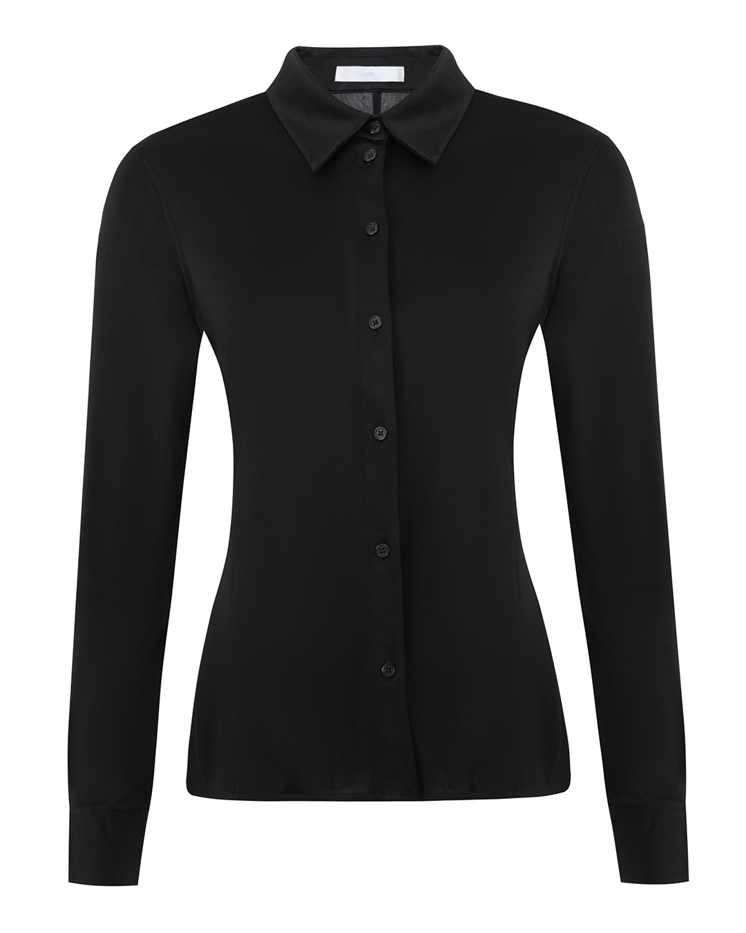 Эта рубашка — классический пример сдержанной элегантности, выполненный с безупречным вниманием к деталям. Глубокий чёрный цвет добавляет изделию универсальности и изысканности, делая её подходящей для любого случая. Талия слегка приталена, что подчёркивает женственную линию и обеспечивает идеальную посадку. Отложной воротник придаёт рубашке строгую геометрию и классическое очарование, оставаясь актуальным вне времени. Длинные рукава заканчиваются аккуратными манжетами, которые акцентируют изысканность и строгость образа. Потайная застёжка на пуговицах обеспечивает чистый и минималистичный вид фасада, скрывая все элементы крепления. Эта рубашка станет идеальной основой как для делового, так и для вечернего гардероба, легко сочетаясь как с классическими брюками, так и с элегантными юбками.