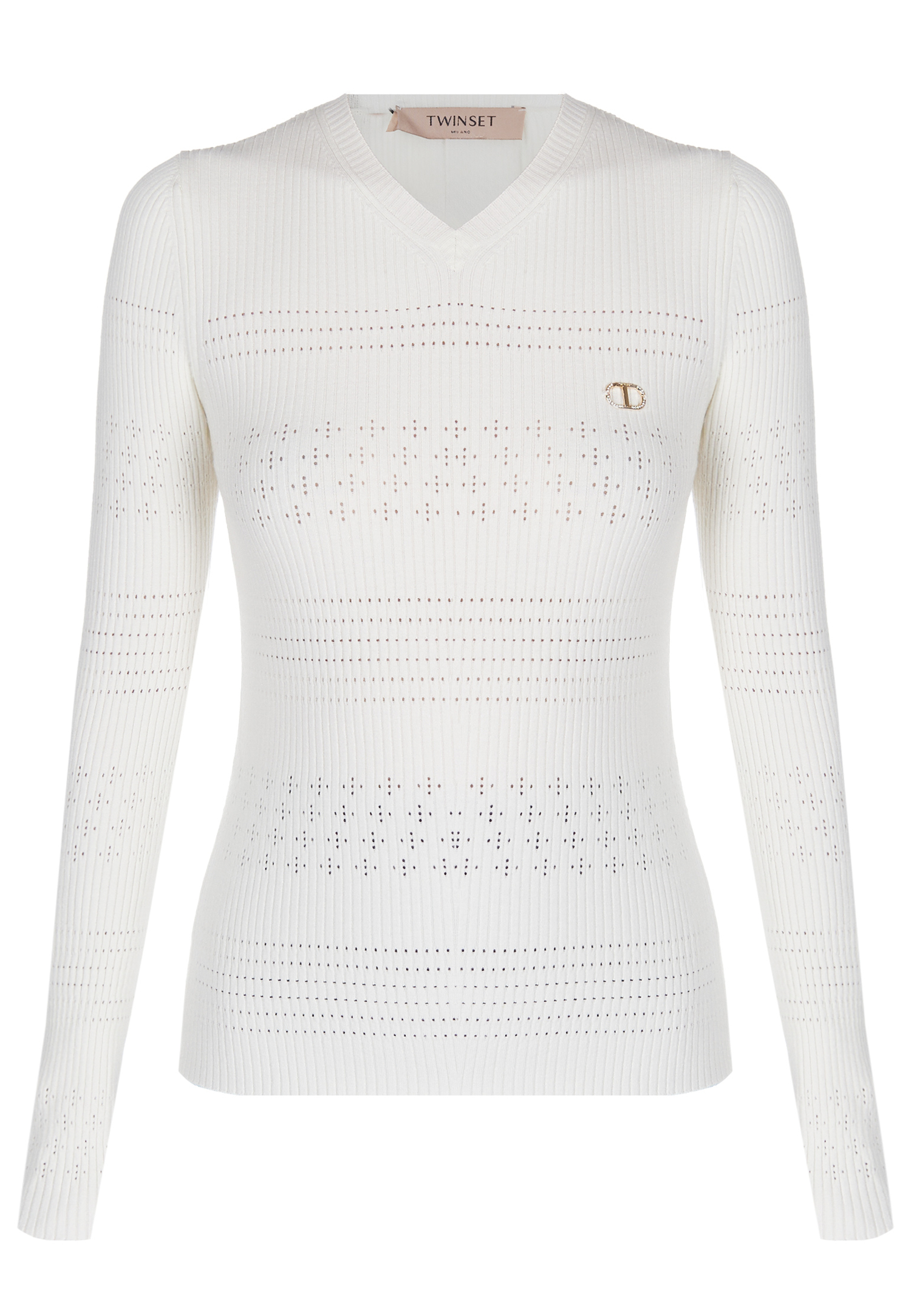 Представляем вам изысканный джемпер от знаменитого бренда Twinset Milano, который воплощает в себе суть итальянской элегантности и мастерства. Эта белая облегающая модель из трикотажа на основе вискозы, с ажурной перфорированной вязкой, предлагается в строгом крое, создающем безупречный силуэт для утонченной модницы. V-образный вырез усиливает женственность, плавно удлиняя шею и привлекая внимание к ключицам. Длинные рукава подчеркивают грациозность и изящность, обеспечивая универсальность модели как для деловой встречи, так и для вечернего выхода. Завершением истинной роскоши служит изящный акцент на груди — логотип Oval T из золотистого металла, напоминающий о безупречном качестве и фирменной изысканности Twinset Milano. Этот джемпер, задуманный и созданный в Италии, станет вашим надежным спутником в мире высокой моды, воплощая современную классику с ноткой утонченного шика.
