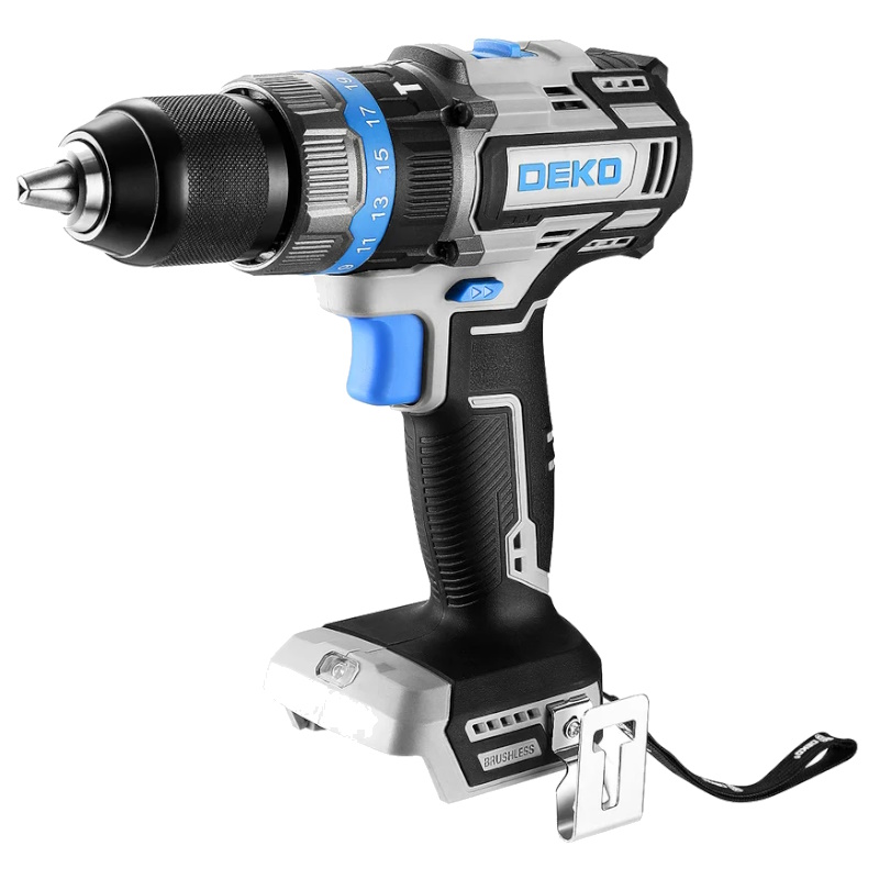 Дрель-шуруповерт аккумуляторная Deko предназначена для сверления отверстий в различных материалах (при установке соответствующих сверл для каждого вида работ), а также для монтажа/демонтажа резьбовых соединений (при установке соответствующих бит и головок). Благодаря наличию функции подсветки можно работать в помещениях со слабым освещением. Компактный и мощный бесщеточный двигатель. Надежный быстрозажимной патрон обеспечивает удобство замены и надежное крепление оснастки. Дрель-шуруповерт поставляется БЕЗ аккумулятора и зарядного устройства.Преимущества Бесщеточный двигатель обеспечивает высокую производительность и долгий срок службы Высокий крутящий момент 80 Нм Функция удара для сверления в кирпиче и бетоне Металлический патрон