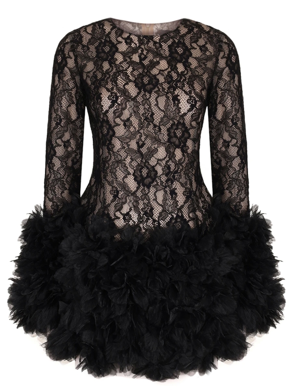-Модель приталенного кроя с длинными рукавами, круглым вырезом горловины, застежкой на молнию сзади и пышной юбкой, собранной из тонкой вуали.