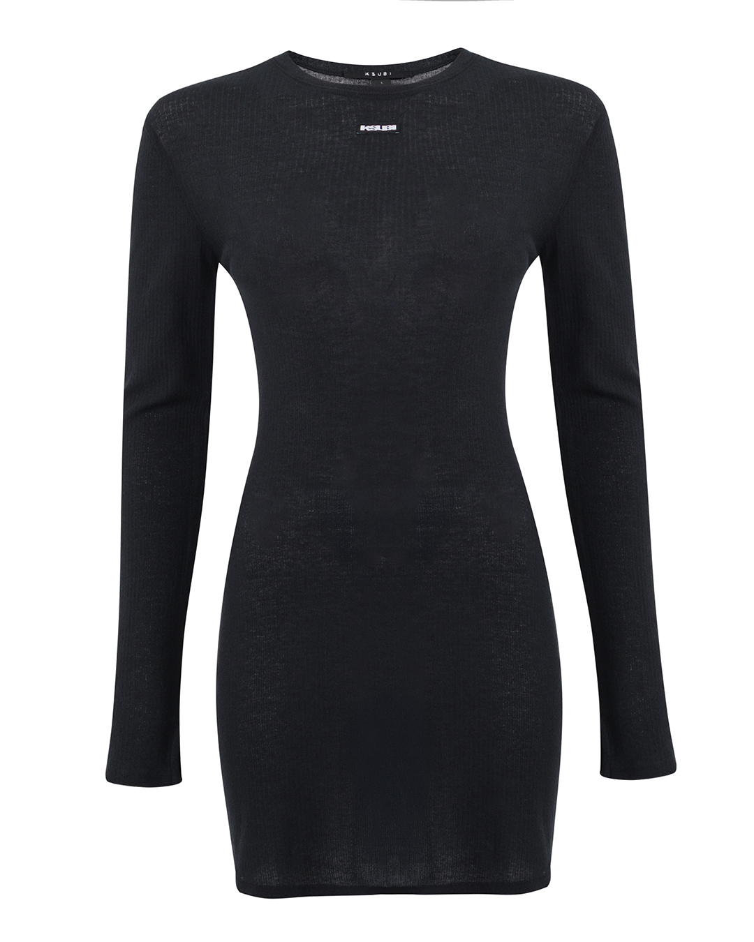 Это платье представляет собой идеальное сочетание минимализма и элегантности, воплощая современный шик в каждой детали. Силуэт "bodycon" подчеркивает изящные линии фигуры, создавая утонченный и соблазнительный образ, который подходит для вечернего выхода или особого события. Чёрный цвет материала акцентирует внимание на чистоте линий, придавая платью универсальность и изысканность. Тонкая структура ткани обволакивает тело, обеспечивая комфорт и свободу движений. Детали отделки заслуживают отдельного внимания: округлый вырез горловины гармонично сочетается с длинными облегающими рукавами, придавая ансамблю завершенность и целостность. Маленький акцентный логотип добавляет лаконичную изюминку, оставаясь стильным и ненавязчивым элементом декора. Все швы выполнены с высоким уровнем мастерства, что обеспечивает идеальную посадку и долговечность изделия. Это платье станет ключевым элементом любого гардероба, позволяя создавать запоминающиеся образы как с лаконичными аксессуарами, так и в сочетании с яркими деталями.