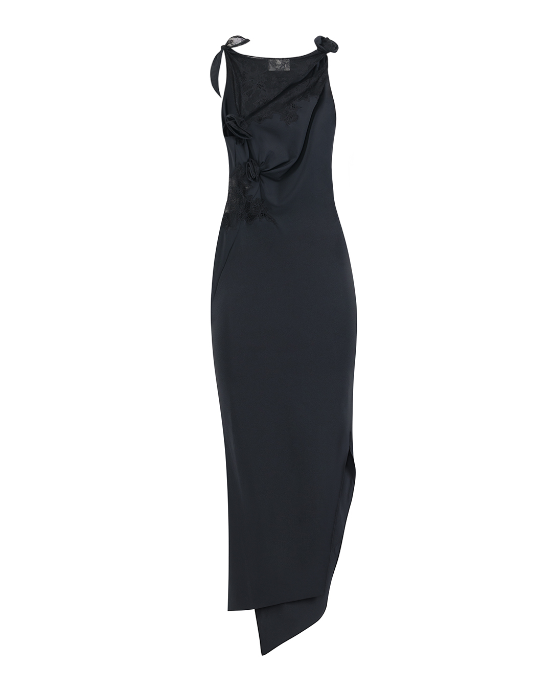 Это платье представляет собой воплощение элегантности и изысканного стиля. Силуэт платья струящимся образом обтекает фигуру, подчеркивая грациозность линий и создавая эффект утонченности и шарма. Ткань платья гладкая и роскошная, она обеспечивает мягкость и комфорт, добавляя благородности общему облику. Особое внимание привлекают детали из изысканного кружева, которые украшают зону декольте и плечо, создавая эффект утонченной грации и загадочности. Драпировка вдоль выреза и плеча дополнена цветочными элементами, добавляющими образу нежности и объемности. Эти декоративные акценты придают платью романтичный и утонченный вид. Асимметричный подол добавляет современной динамики и делает образ более запоминающимся. Эта модель идеально подойдет для вечернего выхода или особого события, подчеркивая индивидуальный стиль и изящество своей обладательницы. Платье создает уверенный и обворожительный образ, превращая каждый момент в захватывающее модное событие.