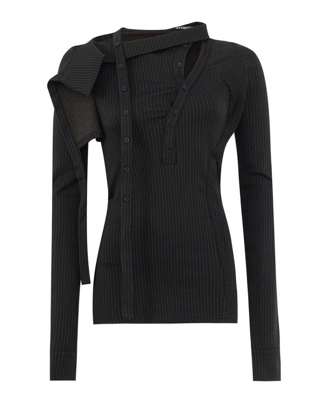 Эта блуза воплощает в себе смелое сочетание классики и современного авангарда, создавая непринужденный, но утонченный образ. Изготовленная из ткани в тонкую полоску, она добавляет визуальную динамику и элегантность. Детали конструкции привлекают внимание своими асимметричными элементами, создавая впечатление непринужденной легкости. Линия плеча с декоративным элементом и полуоткрытым дизайном добавляет оригинальности и зрелищности без излишней вычурности. Планка с пуговицами, центрально расположенная, добавляет традиционных нот в общий современный дизайн. Длинные рукава, элегантно облегающие запястья, создают стройный силуэт и завершают образ с ноткой сдержанной роскоши. Эта блуза станет идеальным выбором для тех, кто хочет внести в свой гардероб нотку инновации, оставаясь в рамках классического стиля. Она прекрасно вписывается как в деловой, так и в повседневный образ, подчеркивая уникальность и вкус своей обладательницы.