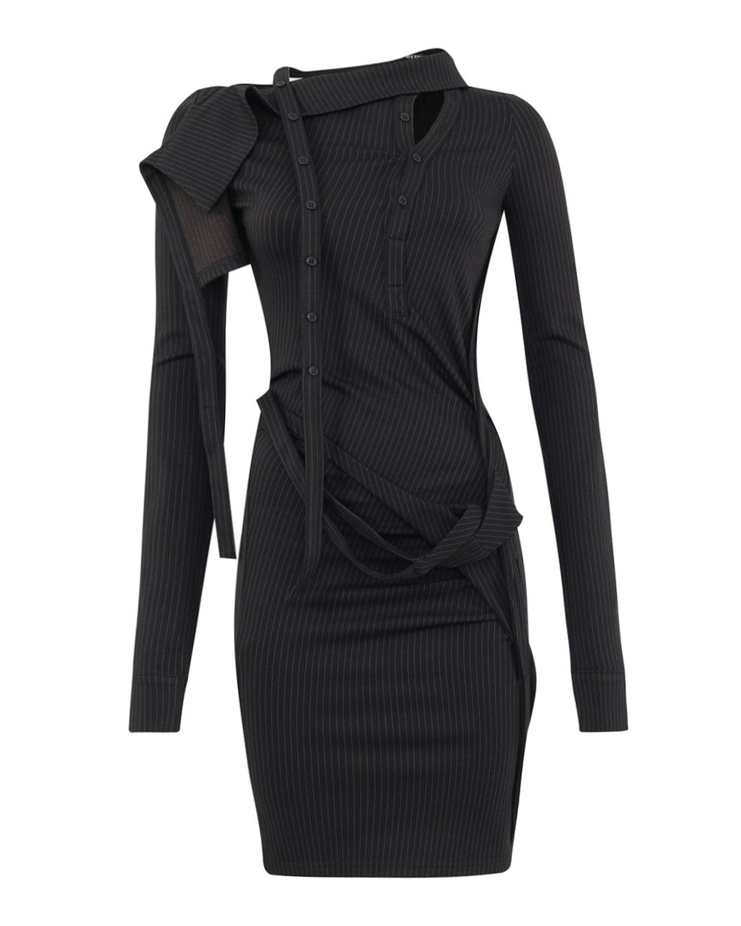 Это платье представляет собой яркий образец современной женственности с нотками авангарда, превращая классические линии в произведение искусства. Используя ткань в тонкую полоску, оно создаёт элегантный вертикальный акцент, визуально вытягивающий силуэт и добавляющий стройности. Эффектный асимметричный дизайн, с акцентом на плече, добавляет динамики и позволяет взглянуть на традиционный крой с неожиданной стороны. Планка с пуговицами по центру придаёт образу строгую симметрию и структурированность, уравновешивая общую композицию. Драпировка и декоративный узел на талии акцентируют внимание на женственных изгибах, добавляя утонченности и демонстрируя индивидуальность. Длинные рукава обеспечивают баланс пропорций и делают образ законченным. Это платье идеально подходит для уверенной женщины, стремящейся продемонстрировать свою оригинальность и стиль, оставаясь при этом в рамках классической элегантности.