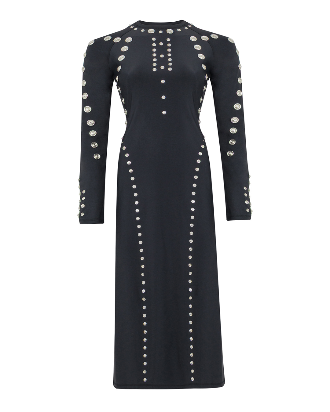 Это платье олицетворяет собой гармонию классического кроя и авангардных деталей, создавая незабываемый визуальный эффект. Приталенный фасон элегантно подчеркивает силуэт, придавая образу изысканность и утонченность. Эластичный материал черного оттенка служит идеальной основой для блестящих металлических акцентов, расположенных по всей длине платья. Эти декоративные элементы образуют геометрический узор, который придает модели современный и дерзкий характер, добавляя динамики и игривости в образ. Высокий ворот создает эффект строгой элегантности, а длинные рукава подчеркивают лаконичность дизайна, контрастируя с богато украшенной поверхностью ткани. Металлизированные элементы взаимодействуют с освещением, добавляя образу мерцающий блеск и привлекая внимание. Это платье станет идеальным выбором для вечернего мероприятия, демонстрируя безупречный вкус и любовь к дерзким модным решениям. Платье, в котором каждая деталь продумана до мелочей, создает образ современной богемы с нотами гламура и роскоши.