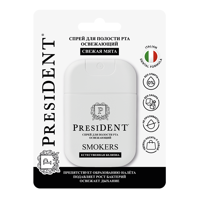 Cпрей для полости рта освежающий President Smokers для десен со вкусом свежая мята. Препятствует образованию налета, подавляет рост бактерий и освежает дыхание. Создан с использованием формулы, разработанной в Италии. Не содержит спирта и сахара.