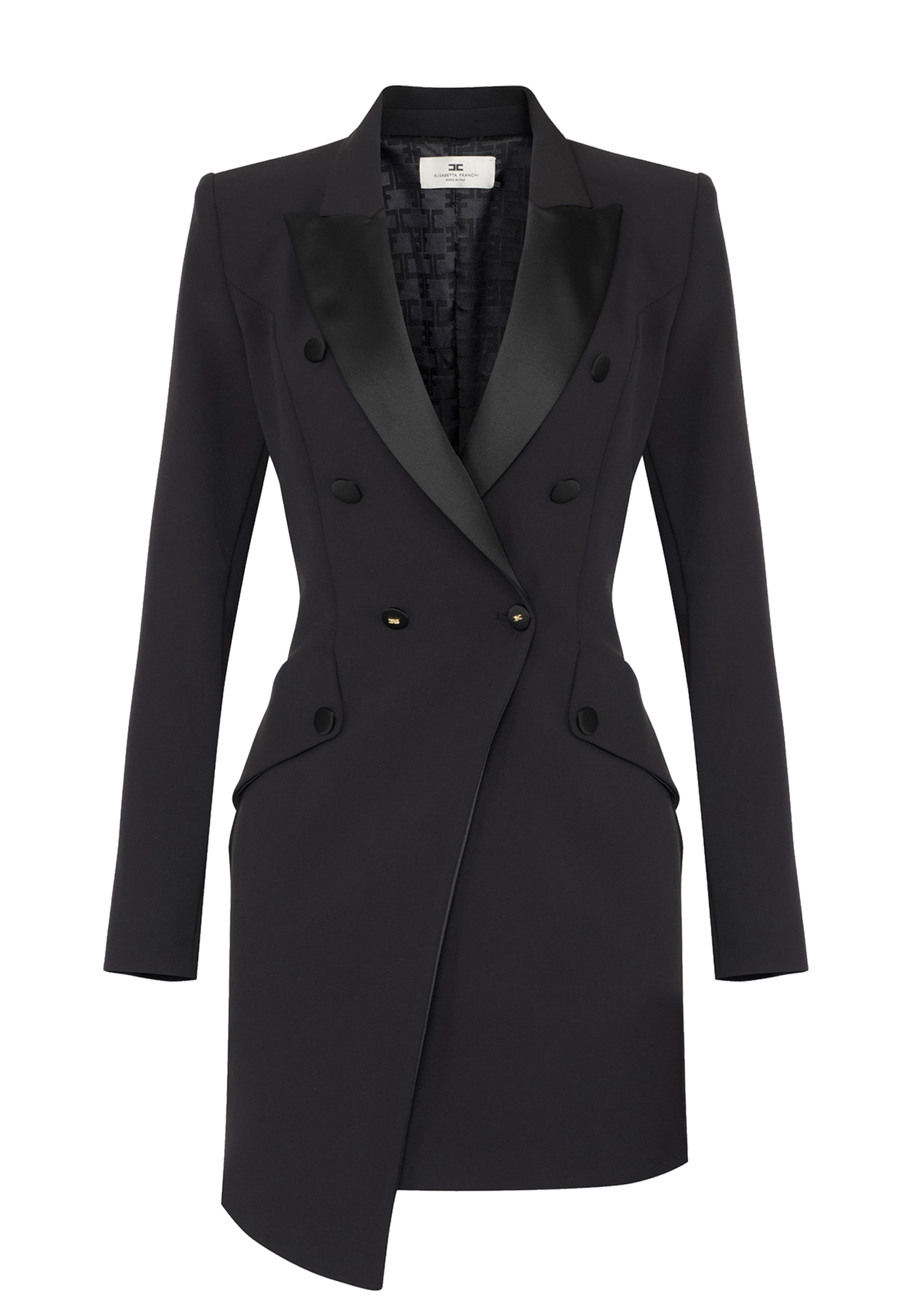 Представляем вашему вниманию роскошное платье-пиджак от знаменитого итальянского бренда Elisabetta Franchi, которое является квинтэссенцией классического стиля и городской утонченности. Элегантное черное изделие, вдохновленное традициями смокинга, выполнено из легкого крепа, мастерски сочетает в себе строгость линий и женственность образа. Приталенный силуэт, подчеркнутый структурированными плечами и мягкими подплечниками, изящно обрисовывает фигуру, добавляя аристократическую нотку. Тонкие атласные лацканы и ленты создают интересный контраст текстур и визуально выделяются на фоне матовой ткани, придавая модели изысканность. Асимметричная юбка добавляет динамичности и современного шика. Аккуратные пуговицы, две из которых украшены логотипом бренда, подчеркивают внимание к деталям, а атласная подкладка с монограммой дарит ощущение утонченной роскоши. Это платье-пиджак, спроектированное и произведенное в Италии, станет ключевым элементом гардероба женщины, ценящей непринужденную элегантность и высокое качество.