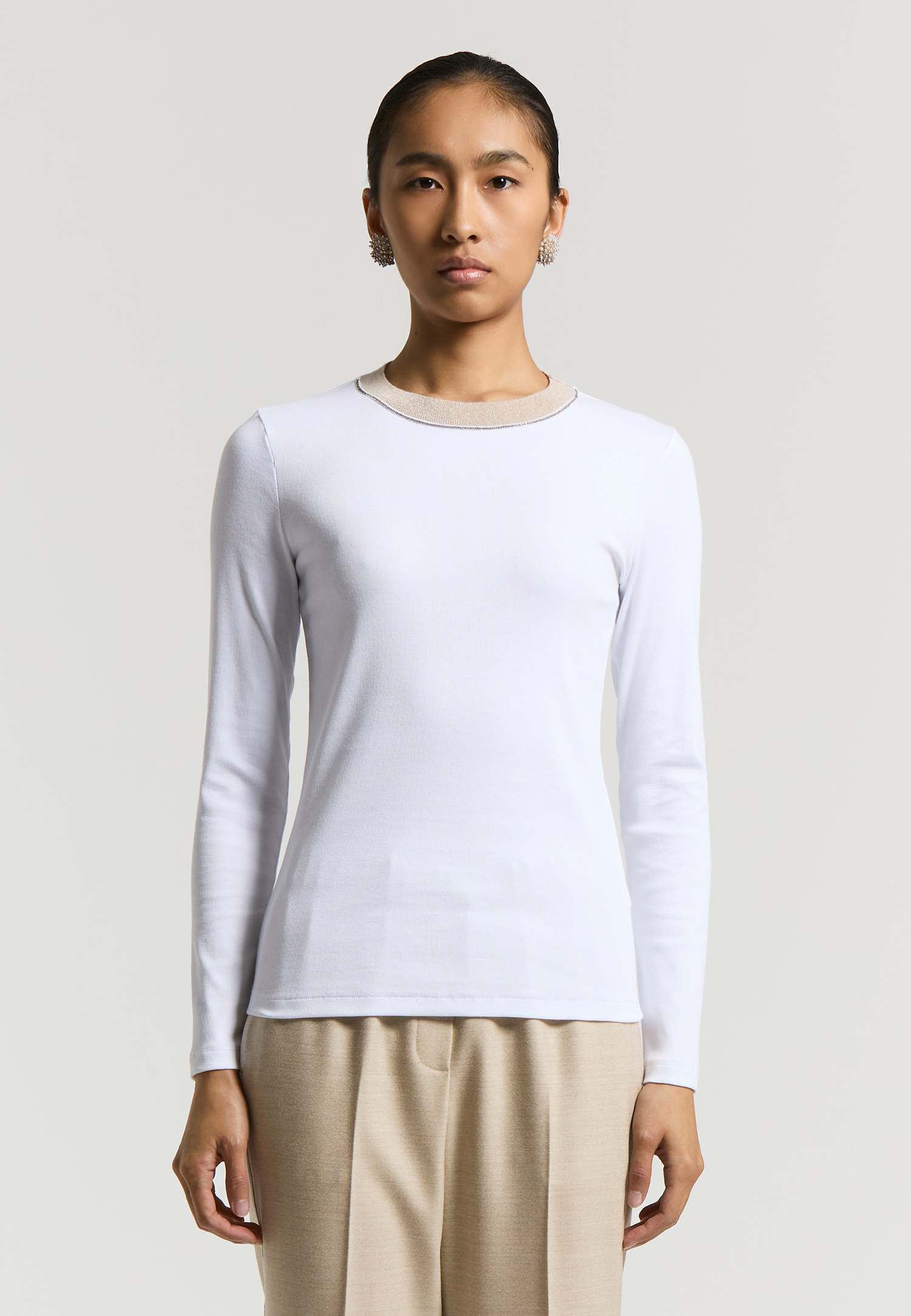 Приталенный лонгслив от Peserico — это воплощение изысканности и утонченного стиля, которое добавит шарма в ваш повседневный гардероб. Изделие выполнено из мягкого трикотажа молочного оттенка, обеспечивая невероятный комфорт и приятные тактильные ощущения от носки. Он подчеркивает женственную фигуру, гармонично выделяя линии силуэта. Особое внимание привлекает акцентная линия горловины, выделенная контрастным оттенком. Элегантные нити монили создают уникальный эффект и придают изделию фирменный стиль Peserico. Этот изящный элемент демонстрирует внимание к деталям и высокое качество исполнения, характерное для итальянского бренда. Лонгслив легко сочетать с различными элементами гардероба, будь то брюки, юбки или джинсы, создавая стильные образы для разных случаев. Это изделие станет прекрасным дополнением вашего гардероба, выделяя вас среди других благодаря своему утонченному дизайну и акценту на деталях.
