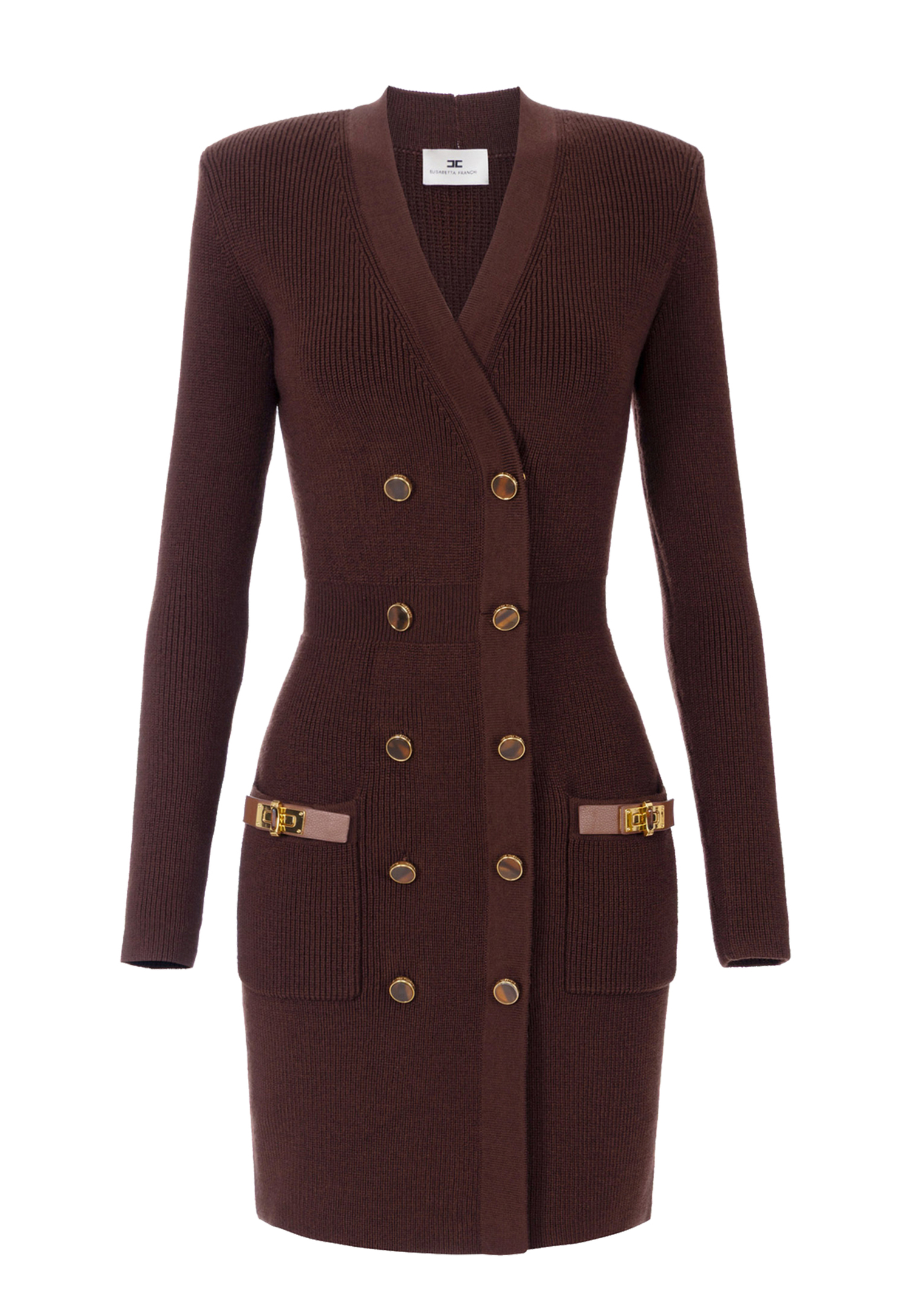 Почувствуйте эстетику высокой моды с этим изысканным шоколадным мини-платьем от Elisabetta Franchi, где классика и городской шик сливаются в едином порыве. Итальянское мастерство, воплощенное в каждой детали, придает этому трикотажному платью-пиджаку особое очарование. Облегающий крой подчеркивает фигуру, а двубортный дизайн с мягкими подплечниками создает утонченный силуэт. Декоративные карманы с ремешками и вращающейся деталью из золотистого металла добавляют роскошный акцент. Пуговицы янтарных оттенков и черепаховые элементы придают изделию благородный характер. Вставки из экокожи и внутренняя застёжка на кнопки завершают этот великолепный образ, делая модель незаменимым для любого гардероба, стремящегося к непринужденной элегантности.