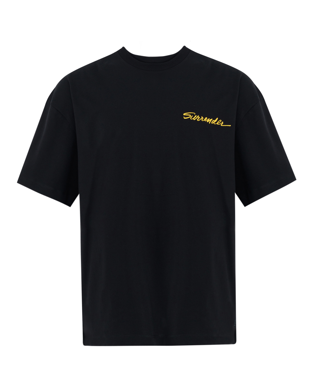 Эта футболка — пример стильного сочетания лаконичности и выразительности в одном уникальном изделии. Выполненная из мягкого хлопка премиум-качества, она обещает комфорт и долговечность, оставаясь базовым элементом с изюминкой. Глубокий черный цвет подчеркивает утонченность и создает эффектный контраст с вышивкой на груди, выполненной в насыщенном жёлтом оттенке. Минималистичная надпись "Surrender" добавляет дерзкую нотку и акцентирует внимание на детали. На спине футболки располагается стильный принт, внушающий динамичность и современность образа, делая её не просто частью гардероба, а настоящим заявлением о стиле. Принт выполнен с точностью и вниманием к каждой линии, обеспечивая долговечность изображения. Классический круглый вырез и свободный крой позволяют сочетать футболку с различными элементами гардероба, создавая как повседневные, так и яркие креативные образы. Продуманность швов и отделки подчеркивает качество и внимание к деталям, гарантируя идеальную посадку и комфорт.