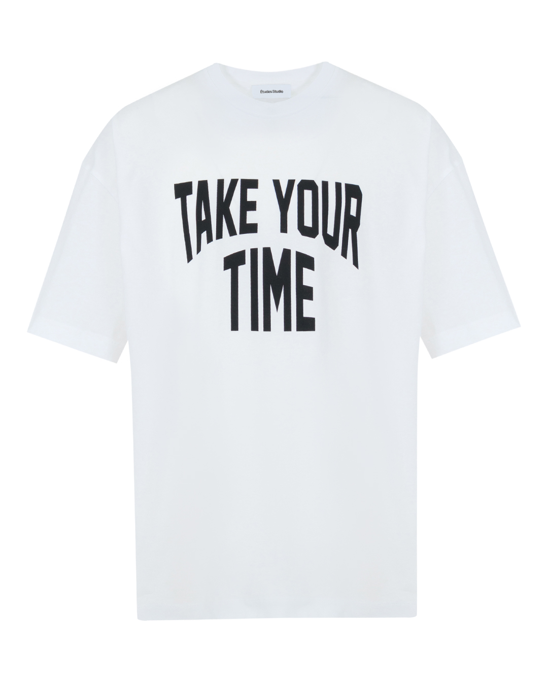 Эта футболка — яркий пример современного стиля с нотками графической элегантности. Изготовленная из высококлассного хлопка, она обеспечивает комфорт и долговечность, демонстрируя безупречное качество. Чистый белый фон создает идеальную основу для эффектного принта. Черный текст "TAKE YOUR TIME" выполнен в актуальном шрифте, добавляя дерзости и уверенности в образ. Свободный крой и классический круглый вырез предлагаются для комфорта и свободы движений, делая эту футболку идеальным выбором для повседневного ношения. Рукава традиционной длины завершают образ, сохраняя его универсальность. Швы аккуратны и укреплены, что свидетельствует о внимании к деталям и мастерству исполнения. Эта футболка отлично впишется в любой гардероб, добавляя выразительности и стиля, подчеркивая вашу современность и индивидуальность.