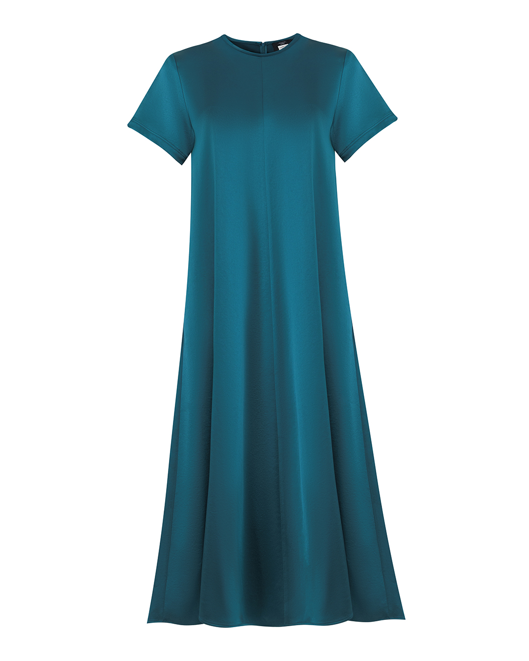 Это платье представляет собой воплощение элегантной простоты и утонченной эстетики. Глубокий бирюзовый оттенок добавляет свежести и благородства, акцентируя внимание на женственности и изысканности. Свободный А-силуэт создает изумительное ощущение легкости и непринужденности, позволяя ткани плавно обвиваться вокруг фигуры. Эффектно продуманный крой подчеркивает естественную плавность линий, обеспечивая идеальную посадку и комфорт. Минималистичный дизайн акцентировал внимание на деталях: аккуратный круглый вырез горловины подчеркивает линию шеи, создавая мягкий и очаровательный акцент. Короткие рукава добавляют нотку расслабленного шика, сохраняющую гармонию образа. Тонкая замаскированная отделка швов и безупречное качество пошива превращают это платье в утонченное произведение искусства, идеальное для как повседневных, так и особенных случаев. Это изделие дарит ощущение легкости и грации, подчеркивая вашу индивидуальность и утонченный вкус.