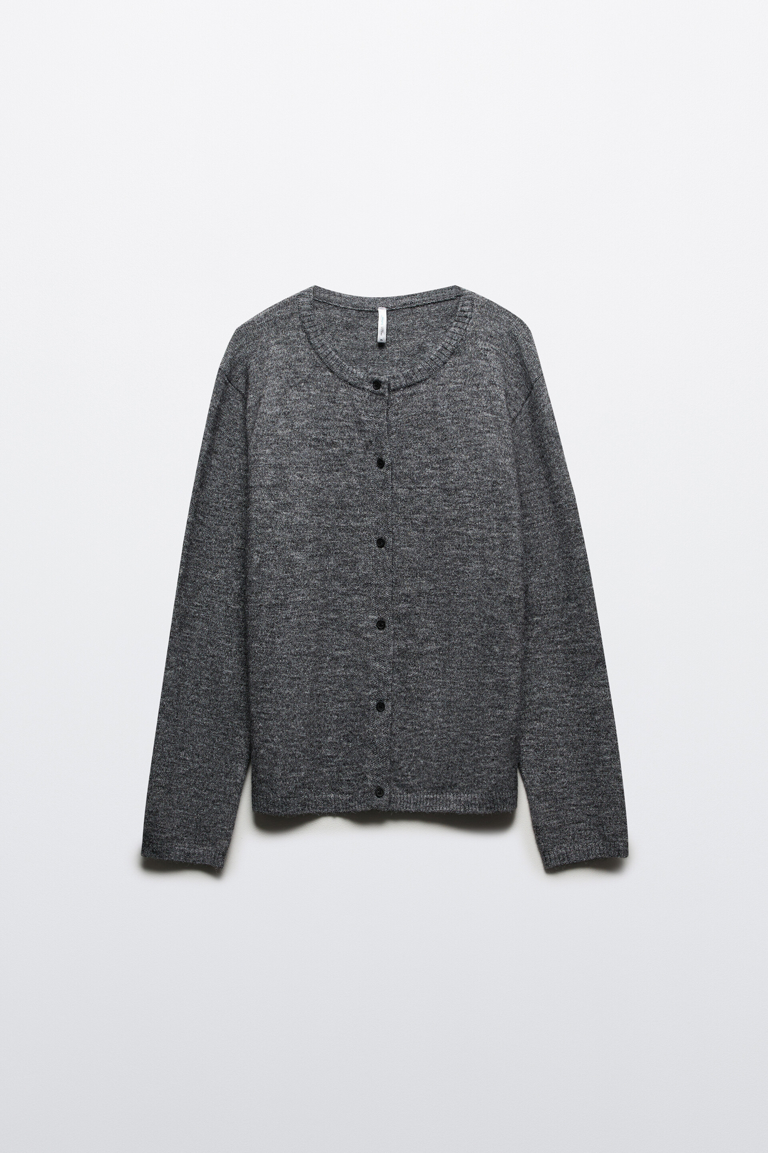 - Круглый вырез горловины в рубчик без воротника. Длинные свободные рукава с прямыми манжетами и спущенной линией плеча. Застежка на пуговицы по всей длине спереди. Прямой нижний край без разрезов и декоративных элементов