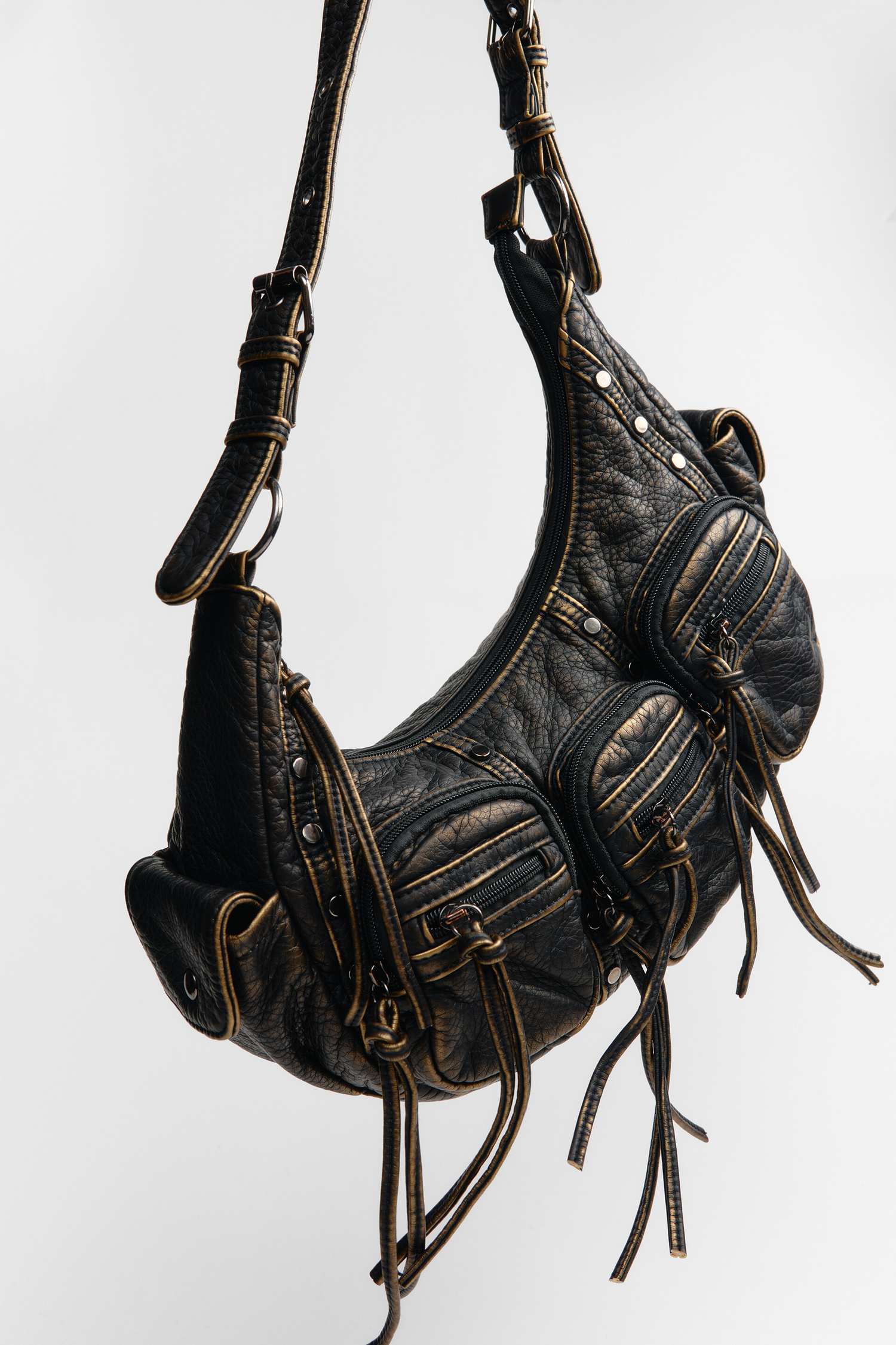 - Короткий широкий ремень на плечо с пряжками и люверсами для регулировки по длине. Одно отделение с застежкой на молнию. Пять накладных карманов с застежками на молнию или кнопку, два внутренних кармашка. Декор из металлических заклепок