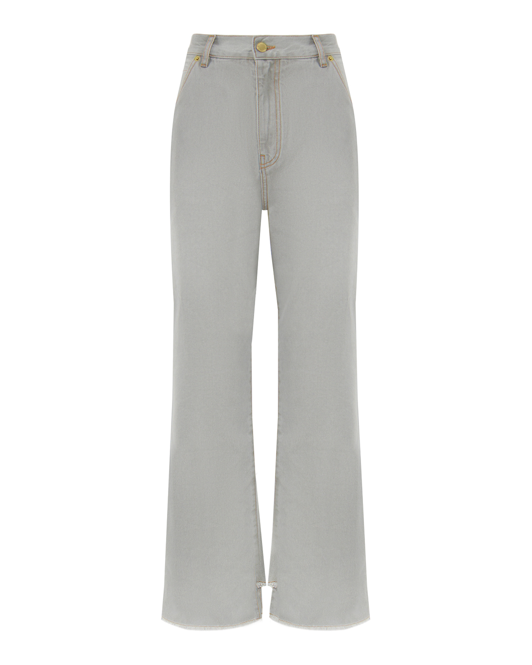 Эти джинсы — олицетворение утонченной простоты и актуального дизайна. Сшитые из мягкого светло-серого денима, они создают ощущение легкости и свежести, идеально подходя для создания непринужденных образов. Расклешенные штанины придают модели нотку ретро-шика, визуально удлиняя ноги и обеспечивая эффектный силуэт. Высокая посадка акцентирует линию талии, добавляя женственности и изящности. Особым акцентом являются аккуратно обработанные швы с контрастной отстрочкой, которая добавляет глубину и динамику. Они подчеркивают структуру джинсов и выводят их на новый уровень стиля. Металлические детали, такие как кнопки и заклепки, выполнены в классическом тоне, что добавляет элегантной завершенности и подчеркивает высокий уровень исполнения. Небольшие разрезы на подоле создают дополнительный акцент и придают современный вид. Эти джинсы прекрасны для ежедневных луков или особых выходов, позволяя сочетать их с различными элементами гардероба, от базовых майок до стильных блуз, создавая образы, полные уверенности и стиля.