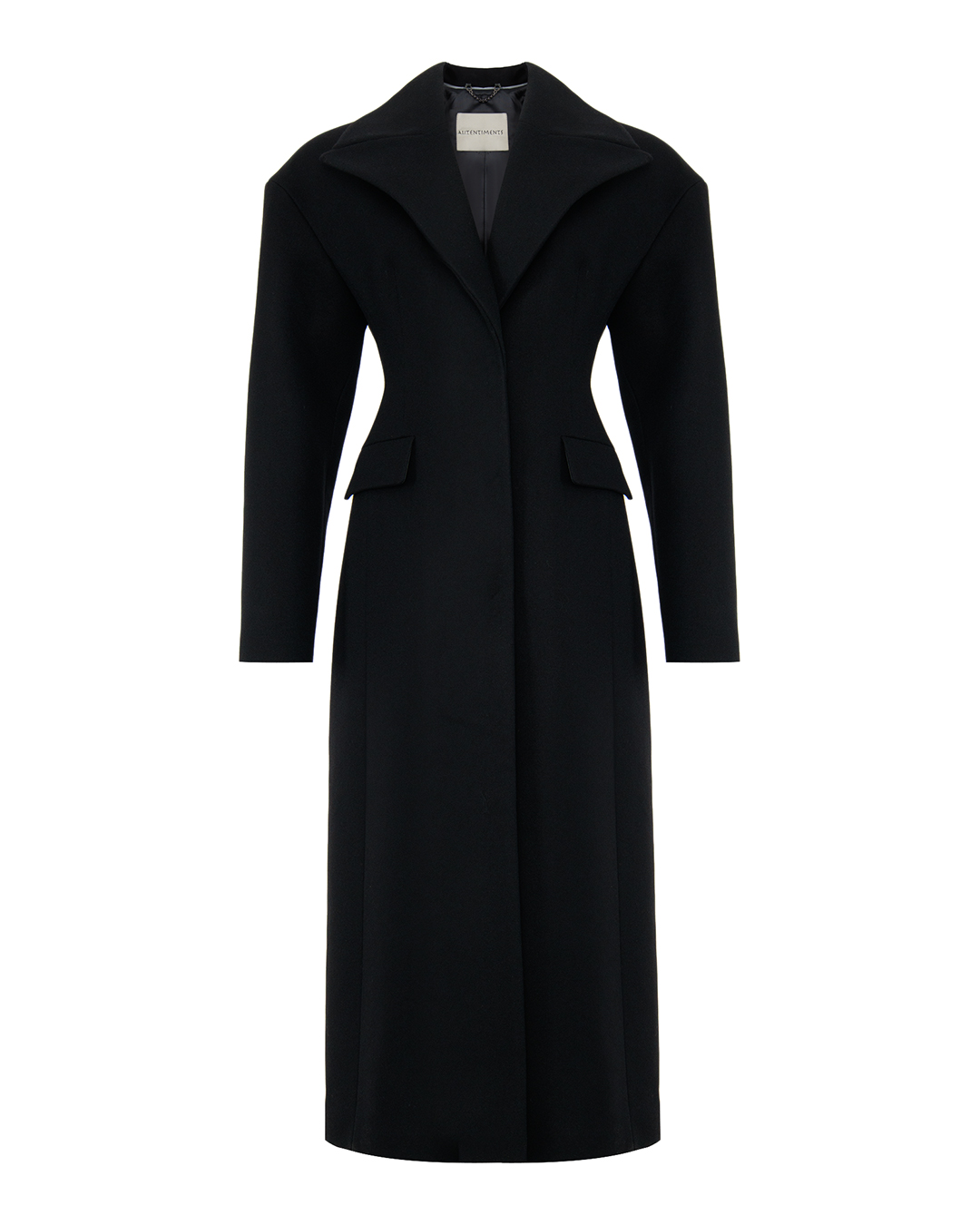 Это пальто — воплощение классической элегантности и современного кроя. Лаконичность силуэта в сочетании с благородным черным цветом создают образ, который завораживает своей утонченностью и изысканностью. Длина до пола придает модели драматичность и великолепие, акцентируя внимание на стройном силуэте. Широкие заостренные лацканы создают эффект изысканной строгости, добавляя вертикальной линии и величия. Они привлекают взгляд к лицу и шее, подчёркивая утончённый стиль и безупречность формы. Элегантная завышенная талия и приталенный крой образуют силуэт, который грациозно подчеркивает изгибы фигуры. Карманы с клапанами добавляют функциональности без потери эстетики, продолжая линию талии и создавая визуальный баланс. Застежка скрытая, что придает модели чистоту линий и минималистичную завершенность. Рукава имеют идеальную длину и плотную посадку, что завершает общий вид с точной аккуратностью. Внутренний подклад из гладкой ткани не только обеспечивает комфорт, но и подчеркивает высокий уровень качества и внимание к деталям.