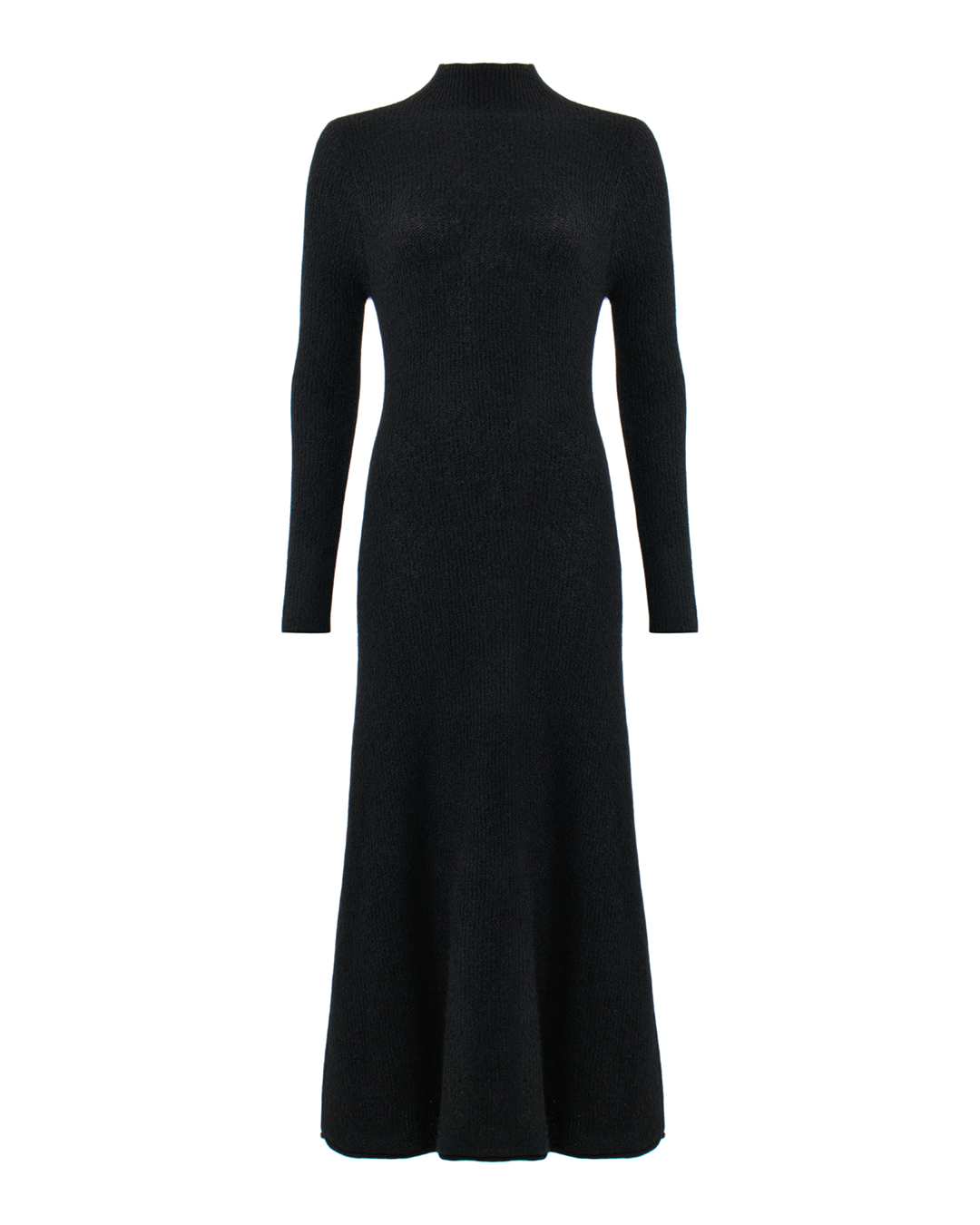 Это изысканное платье демонстрирует утонченную элегантность и неподвластный времени стиль. Выполненное из мягкой вязаной ткани, оно идеально облегает фигуру, акцентируя каждый изгиб и создавая соблазнительный силуэт. Высокий воротник добавляет нотку сдержанной элегантности, придавая образу чуть больше формальности и изящества. Длинные рукава подчеркивают утонченность и придают дополнительный комфорт в прохладную погоду. Легкий клеш от линии бедер добавляет динамики и изящества каждому вашему шагу, а длина миди делает это платье универсальным выбором для различных мероприятий — от деловых встреч до вечерних выходов. Детали отделки выполнены с безупречной аккуратностью, что подчеркивает качество и внимание к деталям. Это платье станет классическим выбором в вашем гардеробе, отражая вашу индивидуальность и чувство стиля с непринужденной элегантностью.