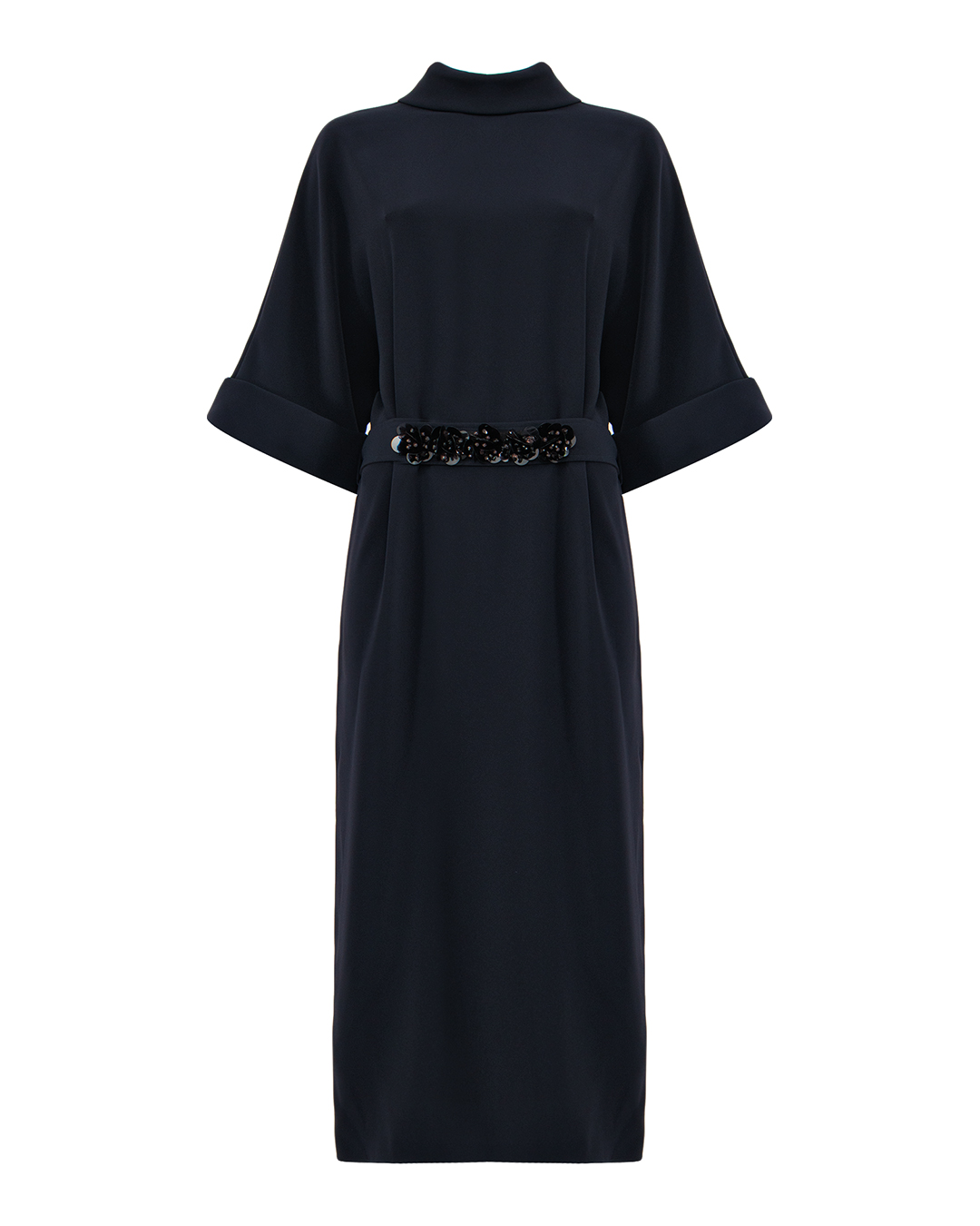 Это платье воплощает изысканность и стильную лаконичность. Прямой силуэт и мягкая драпировка создают элегантный образ, сохраняя свободу движений. Воротник-стойка добавляет нотку утонченной изысканности, плавно обрамляя линию шеи. Пояс служит ключевым акцентом, деликатно подчеркивая талию и создавая изящный силуэт. Уникальная отделка в виде цветочных аппликаций на поясе добавляет нежности и выразительности, превращая платье в произведение искусства. Короткие рукава с разрезами обеспечивают комфорт и динамику, предоставляя возможность добавить бижутерию для завершения образа. Ткань приятна на ощупь и отличается качеством, подчеркивая тонкость цветового решения. Это платье — идеальный выбор для мероприятия или вечеринки, где требуется тонкая грань между классикой и современным стилем, подчеркивая ваш вкус и чувство прекрасного.