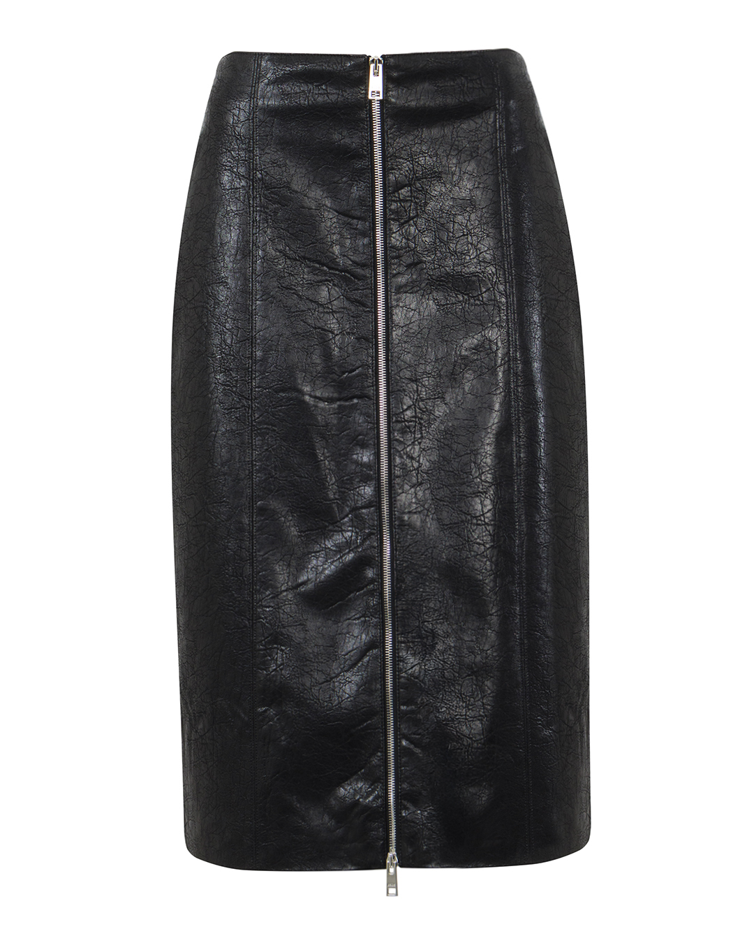Эта юбка-миди из искусственной кожи является воплощением современного шика и ультра-модного стиля. Гладкая текстура и глубокий черный цвет придают изделию изысканный и лаконичный вид. Центральный декоративный элемент — это массивная металлическая молния, проходящая по всей длине передней части юбки. Она не только выполняет практическую функцию, но и добавляет эффектный акцент, создавая незабываемый образ с легким налетом дерзости. Прямой крой подчеркивает элегантный силуэт и акцентирует внимание на линиях фигуры, придавая образу женственность и силу одновременно. Эта юбка идеально впишется как в деловой гардероб, так и станет отличной основой для вечернего наряда. Сочетая ее с минималистичными топами или роскошными блузками, можно создать множество стильных образов, подчеркивающих индивидуальность и вкус.