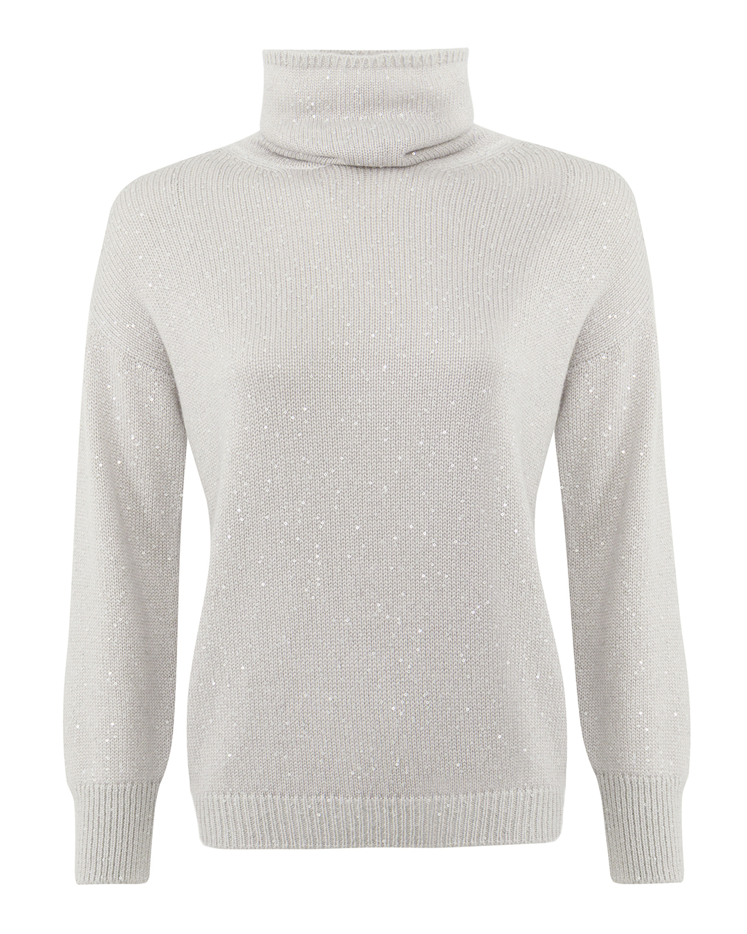 Эта водолазка — квинтэссенция стиля и изысканности, сочетающая в себе элегантность и комфорт. Мягкий светло-серый оттенок с лёгким блеском придаёт изделию шикарный вид, делая его идеальным для как повседневных, так и вечерних выходов. Высокий воротник уютно обрамляет шею, добавляя образу утончённости и женственности. Тонкий переливающийся декор создаёт эффект мерцающего свечения, который привлекает внимание и добавляет нотку роскоши. Деликатная вязка и аккуратная отделка манжет и нижнего края обеспечивают идеальную посадку, акцентируя внимание на изящных линиях фигуры. Тонкие швы подчёркивают высокое мастерство исполнения и делают изделие визуально лёгким. Эта водолазка станет стильным элементом любого гардероба, идеально дополняя как классические, так и современные комплекты, подчеркивая вашу безупречность и тонкий вкус.