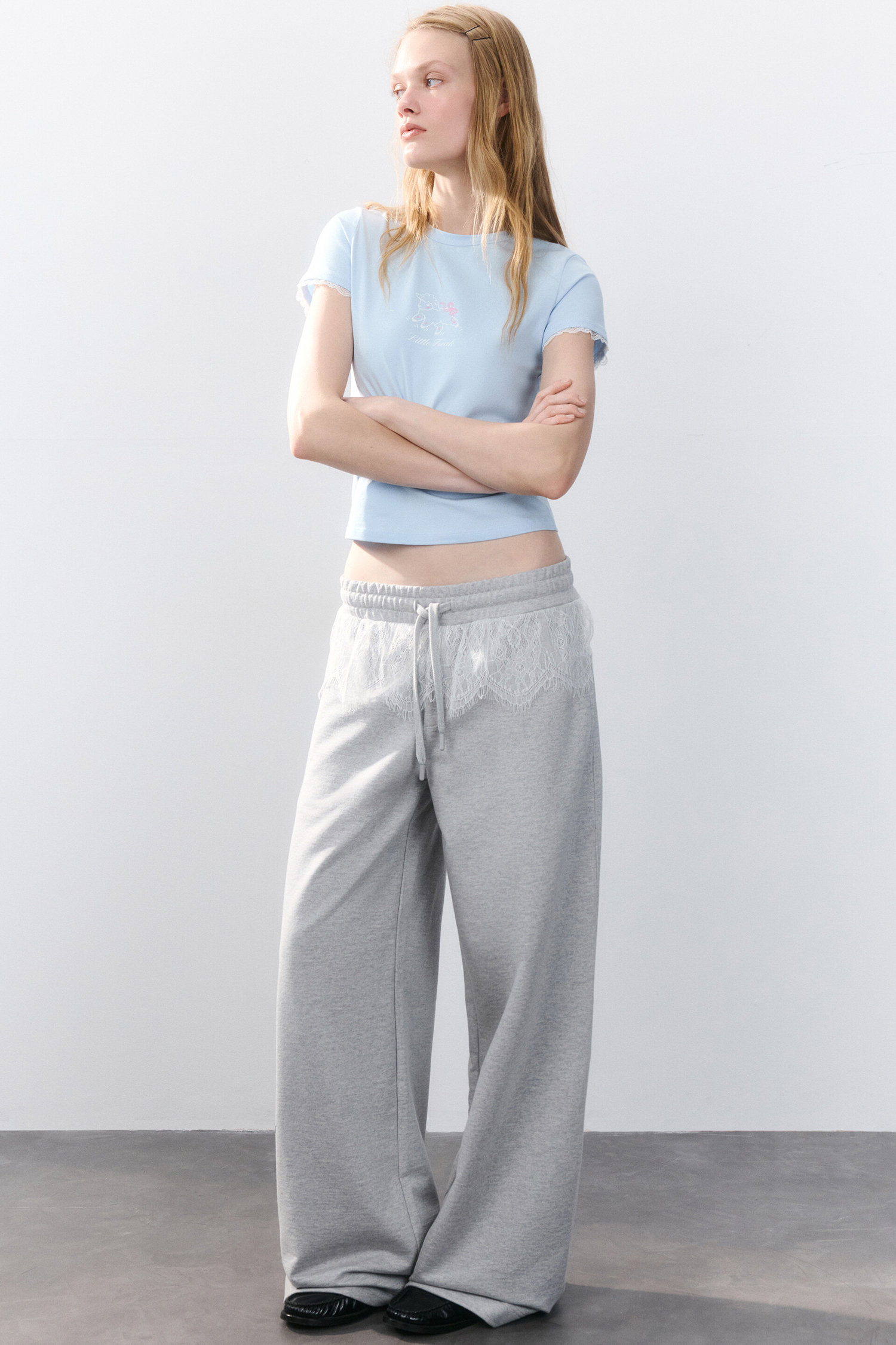 - Комфортная высокая посадка по талии подчеркивает фигуру и скрывает недостатки. Широкий эластичный пояс-резинка на завязках, декоративная кружевная баска. Два боковых кармана в шве. Длинные широкие штанины без разрезов