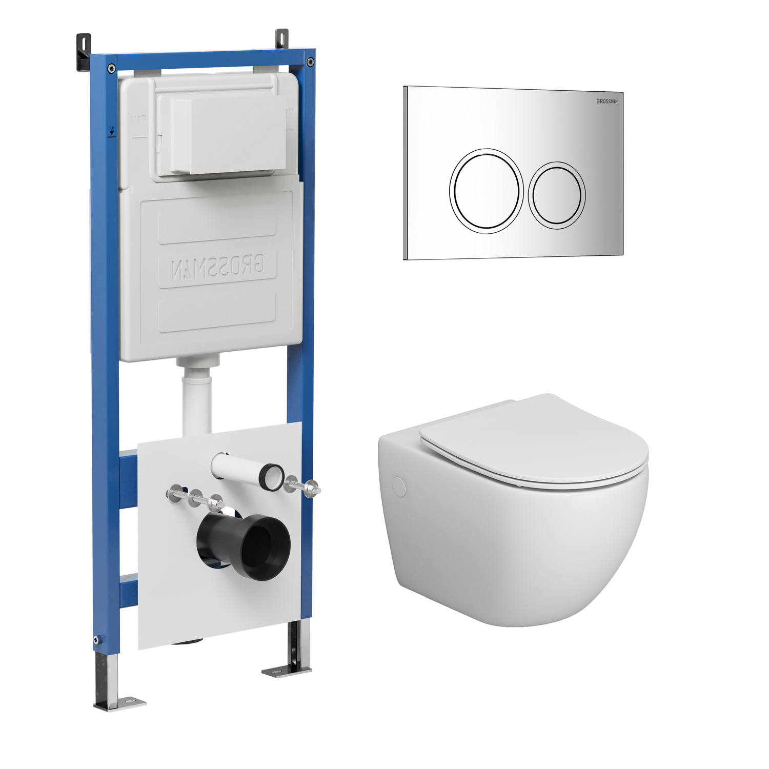 Комплект Унитаз подвесной с инсталляцией Grossman Galaxy 97.4411SQ.01.100 безободковый, белый+ Кнопка смыва хром глянцевый