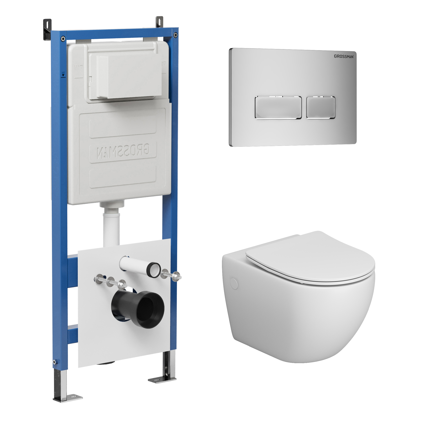 Комплект Унитаз подвесной с инсталляцией Grossman Pragma 97.4411SQ.03.110 безободковый, белый+ Кнопка смыва хром матовый