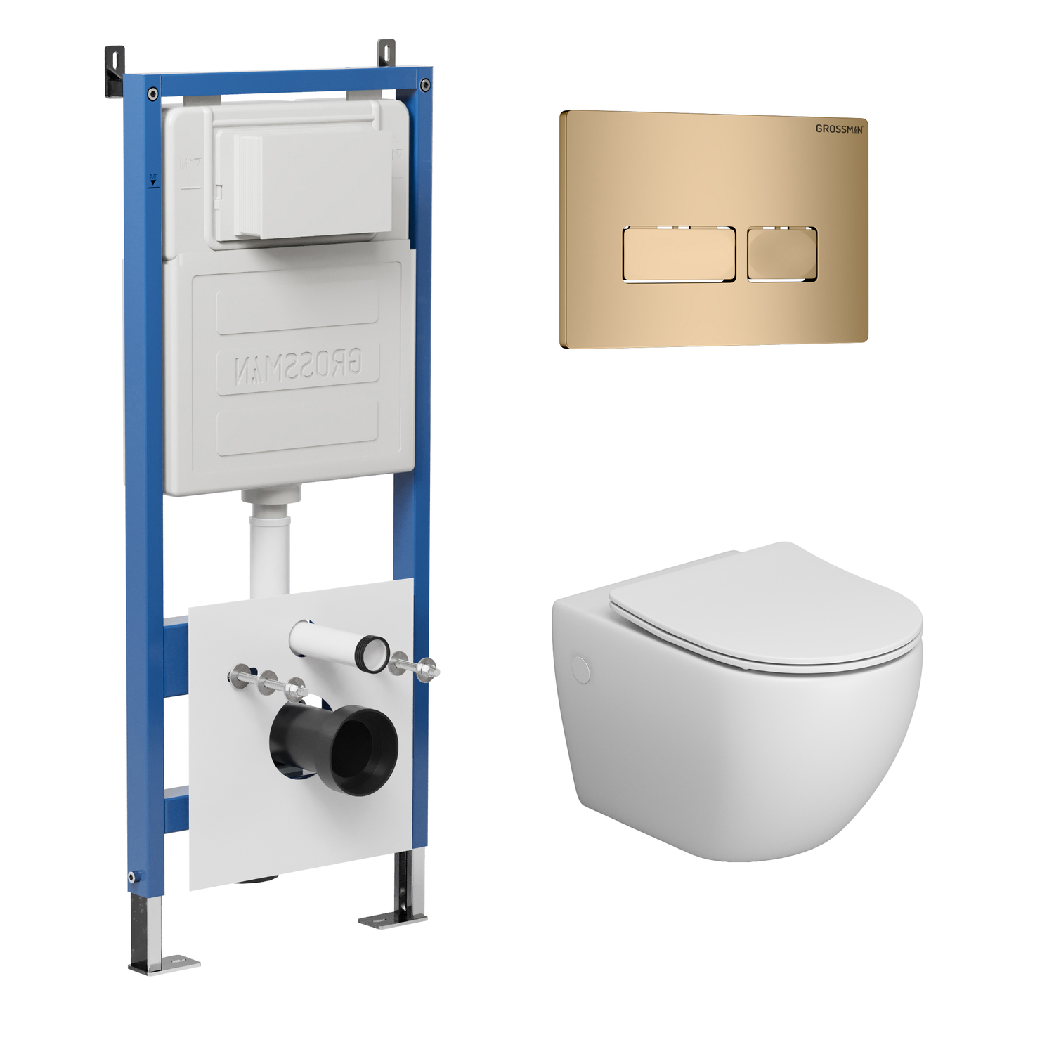 Комплект Унитаз подвесной с инсталляцией Grossman Pragma 97.4411SQ.03.310 безободковый, белый+ Кнопка смыва золото матовое