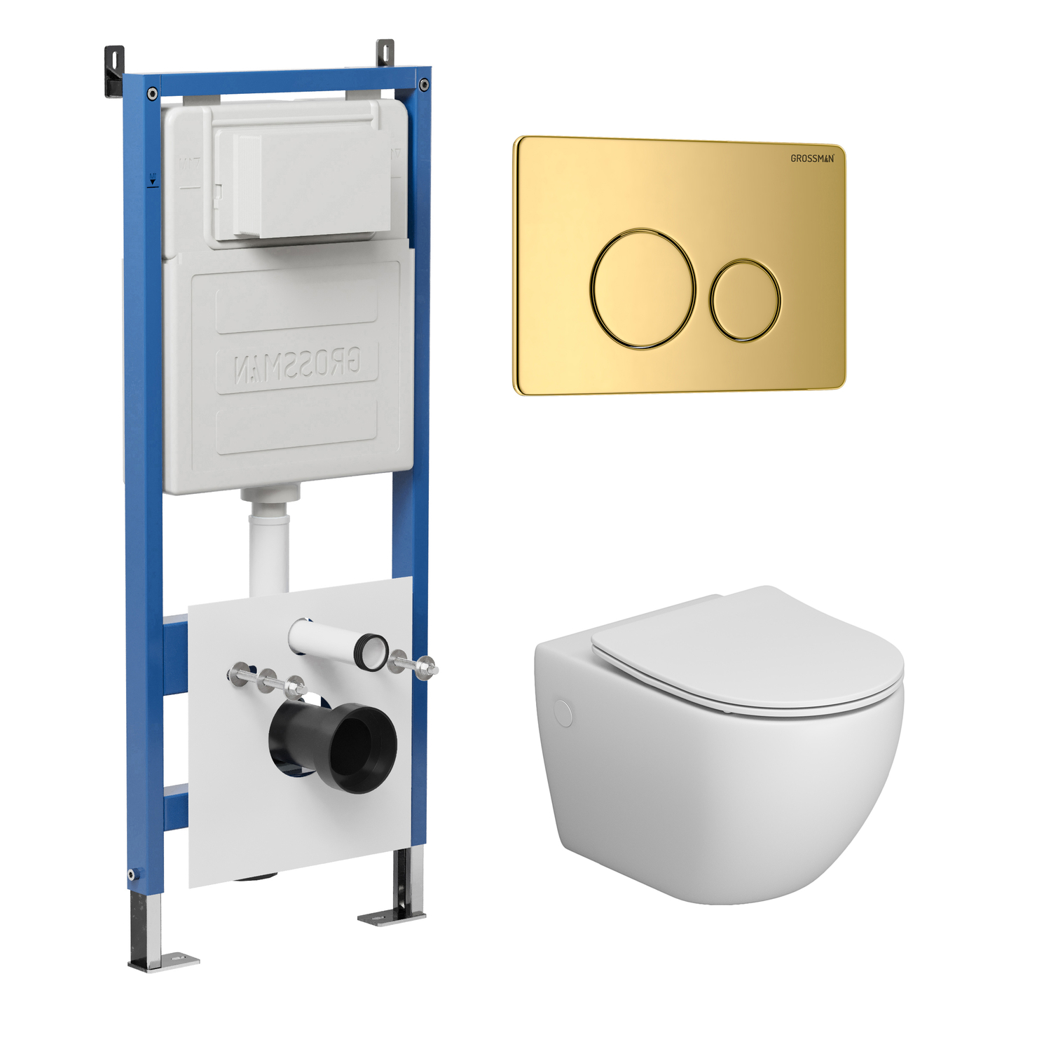 Комплект Унитаз подвесной с инсталляцией Grossman Style 97.4411SQ.05.30M безободковый, белый+ Кнопка смыва золото глянцевое
