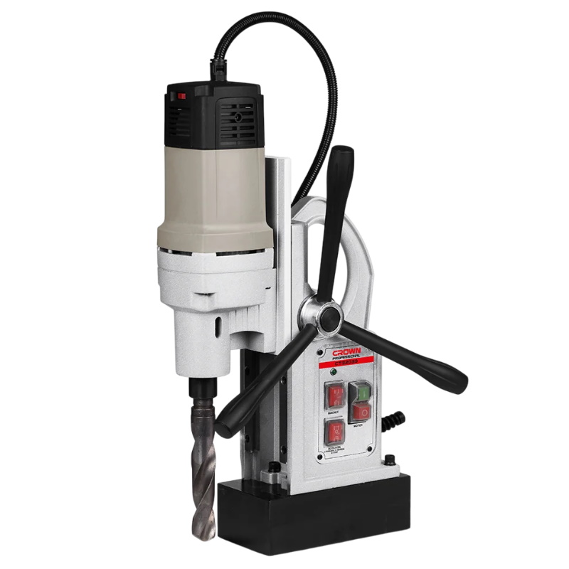 Станок сверлильный Crown (CS), магнитный - предназначен для обработки заготовок из металла повышенной толщины и выполнения отверстий большого диаметра, благодаря высокой мощности двигателя.Преимущества Магнитное основание обеспечивает надежную фиксацию оборудования на металлических поверхностях Мощный магнитный элемент позволяет выполнять работы с высокой устойчивостью на вертикальных и потолочных плоскостях Реверс: полезен для извлечения сверла из заготовки или для нарезки резьбы Регулировка скорости: позволяет адаптировать станок под разные материалы и диаметры сверления Система охлаждения: подача охлаждающей жидкости (СОЖ) увеличивает срок службы сверл и улучшает качество и скорость сверления Защита от перегрева: автоматическое отключение при перегрузке